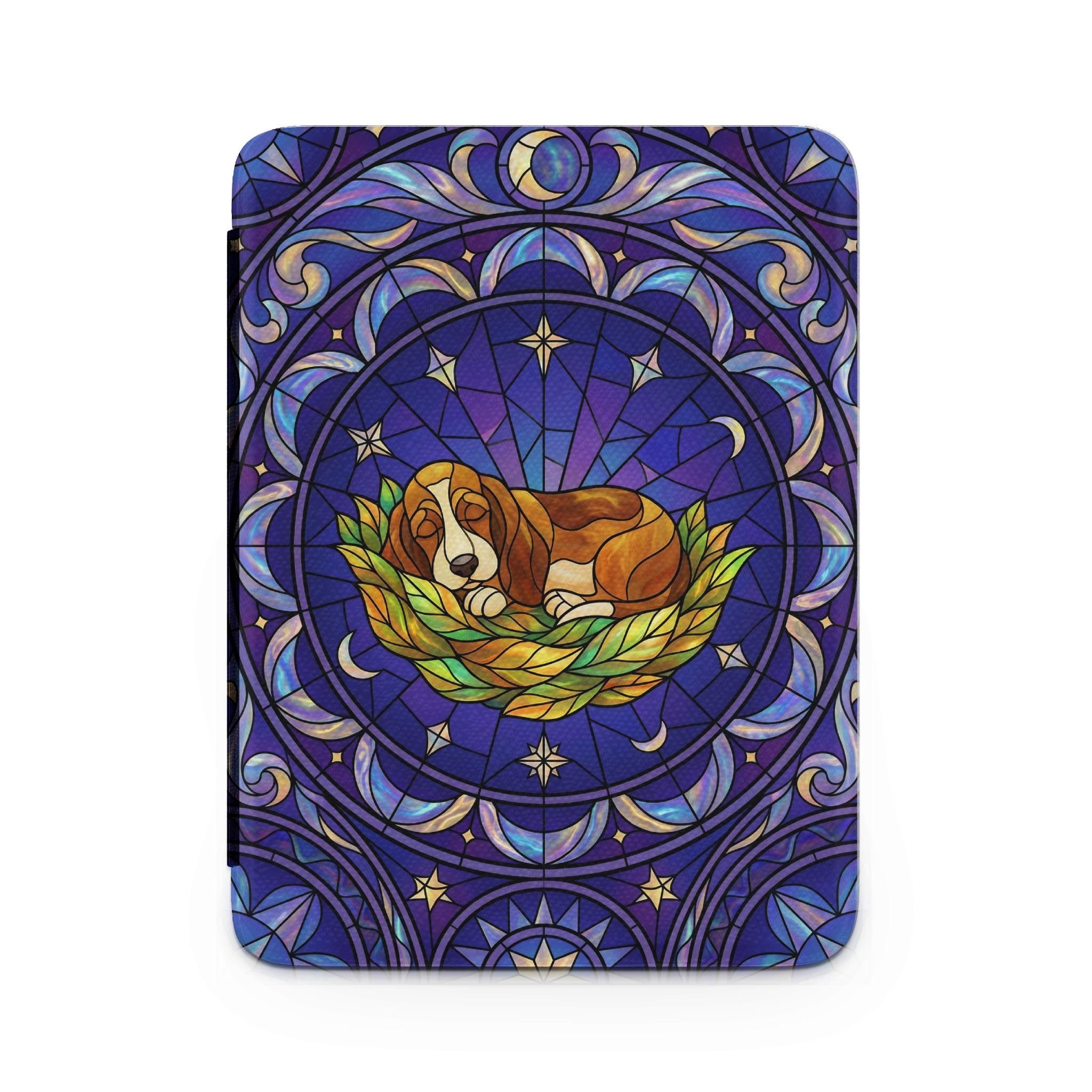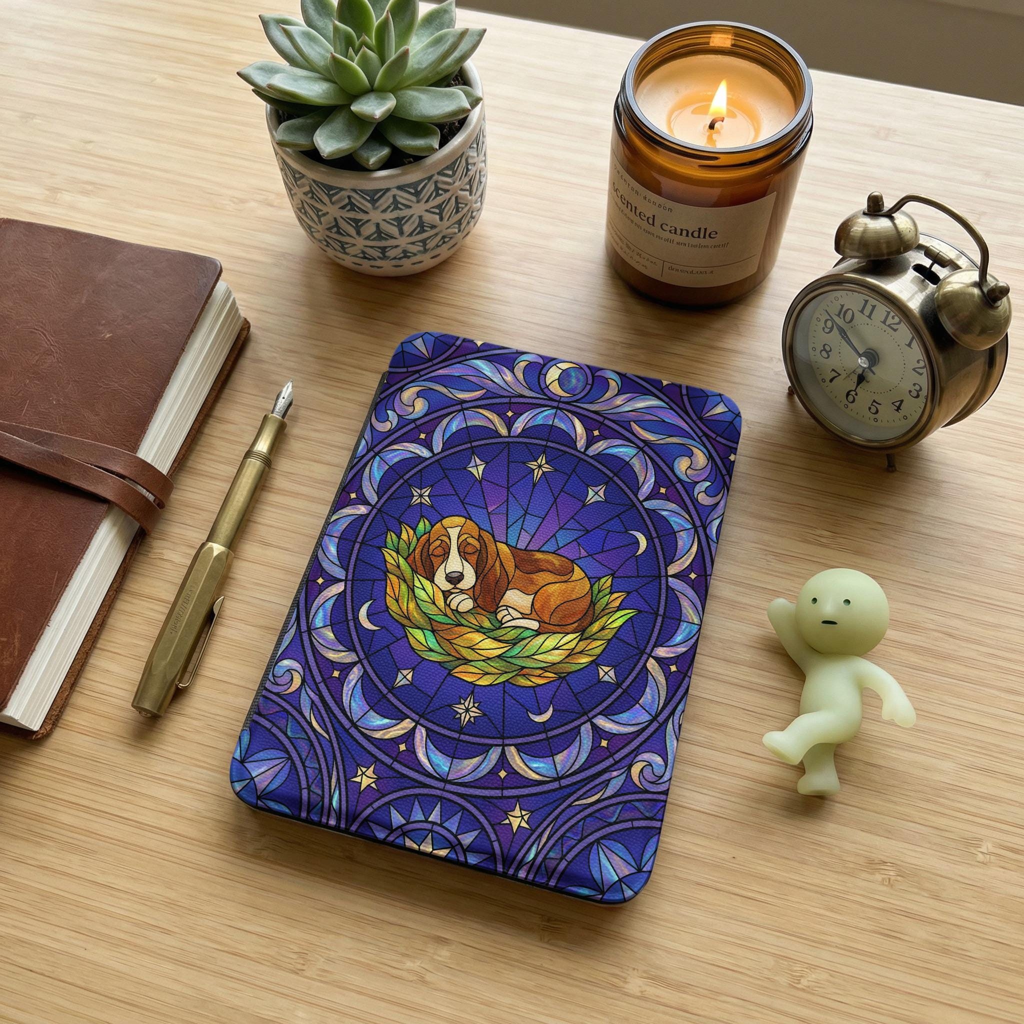 This beautiful Kindle case features a stunning stained glass design. A peaceful Basset Hound sleeps nestled in leaves, surrounded by moons and stars, evoking a celestial and tranquil atmosphere. Protect your Kindle in style with this unique and eye catching design.
