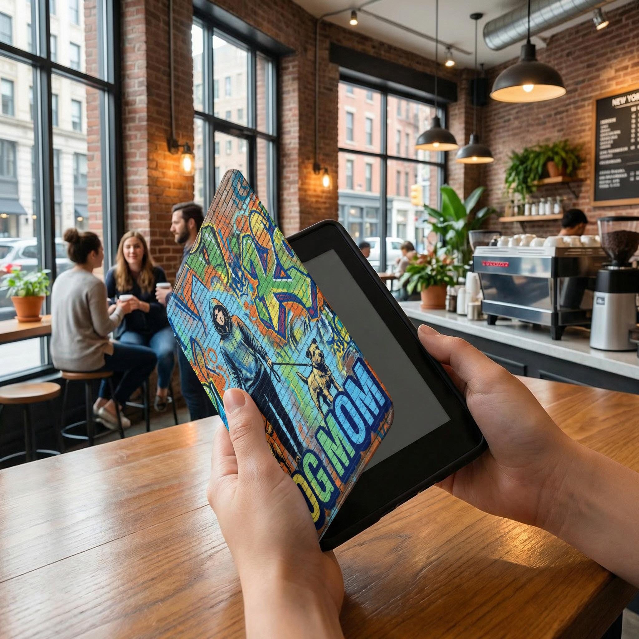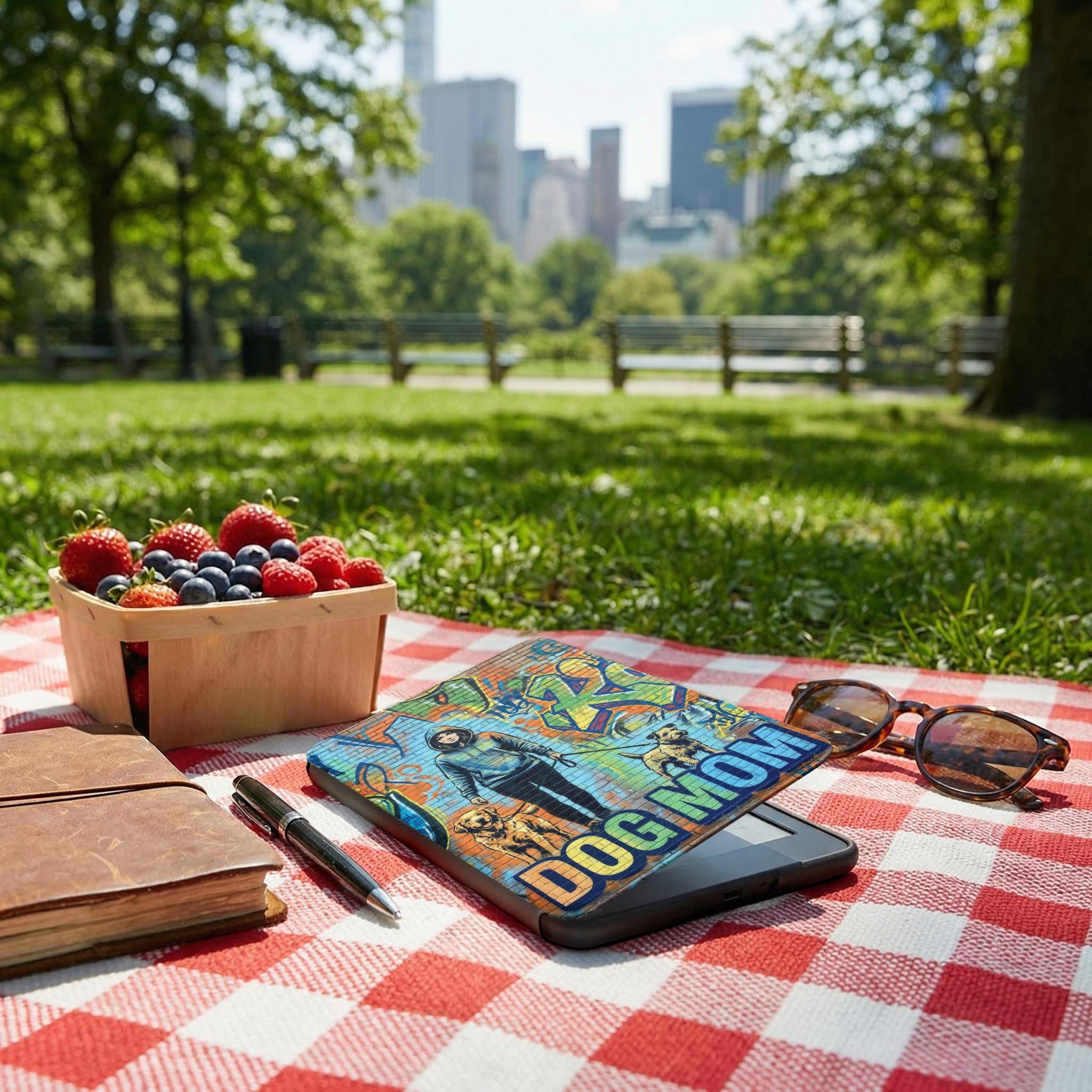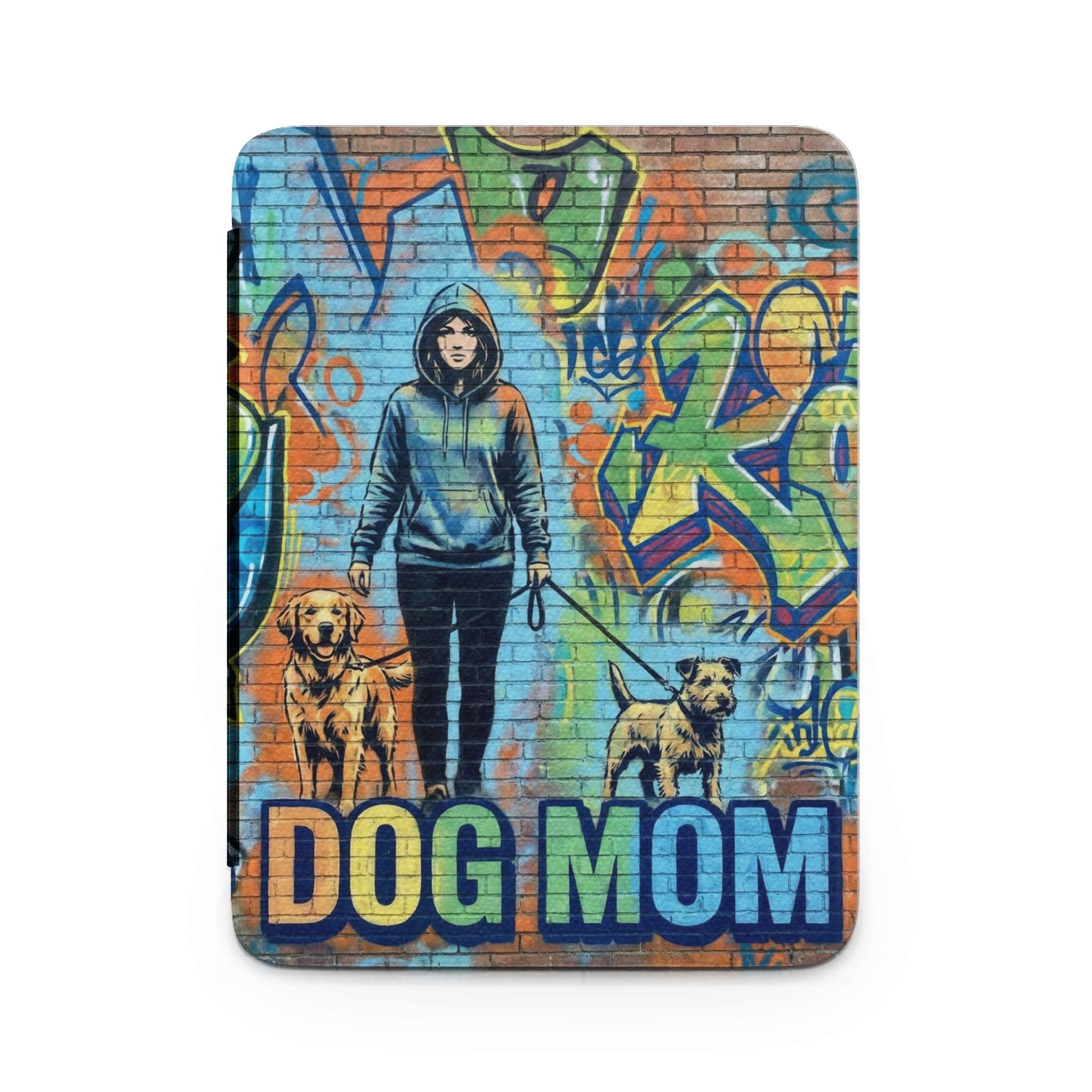 Elevate your reading experience with this eye-catching Kindle case, featuring a stunning graffiti-style design of a dog mom with her furry companions. Protect your Kindle in style with this unique and trendy accessory, perfect for dog lovers and bookworms alike.