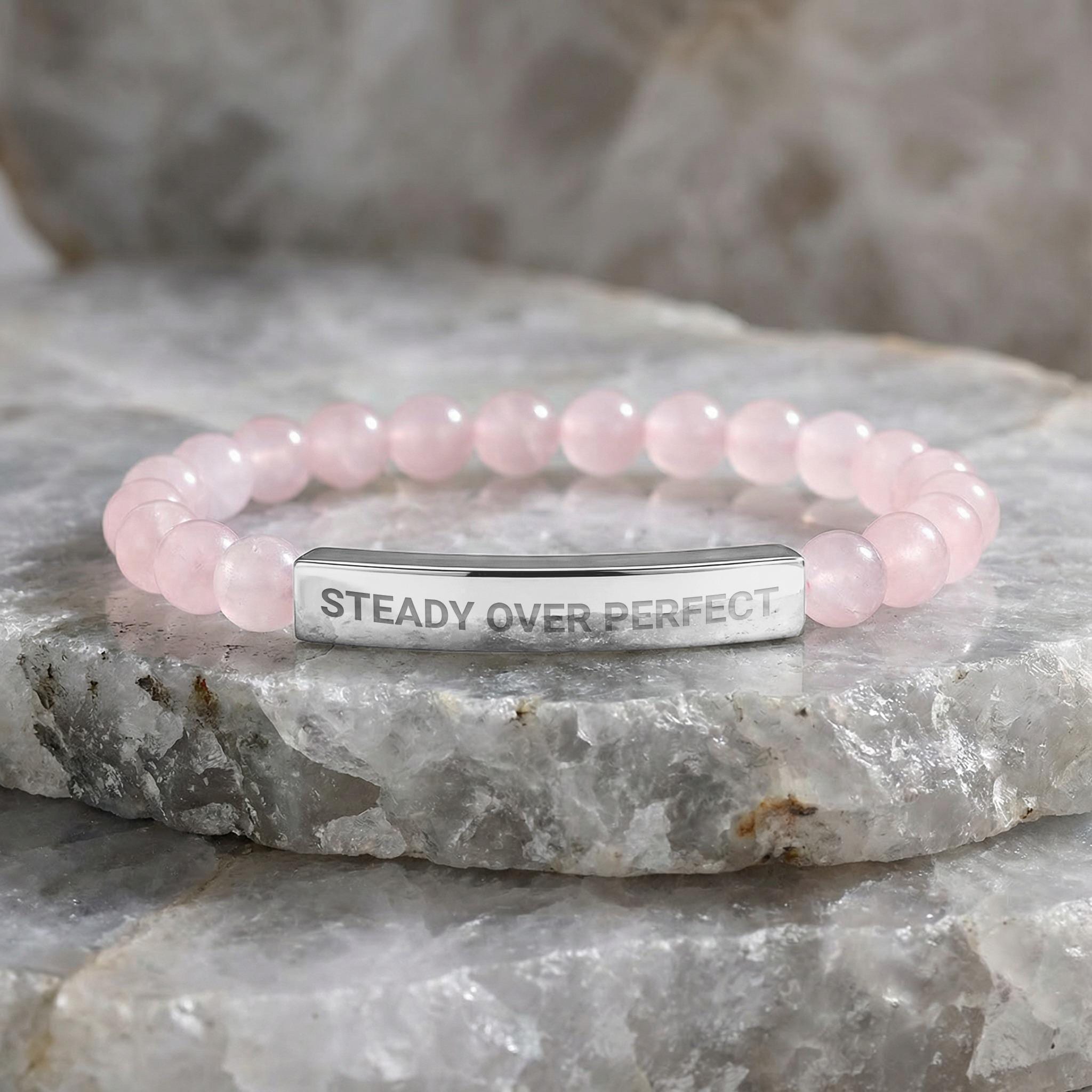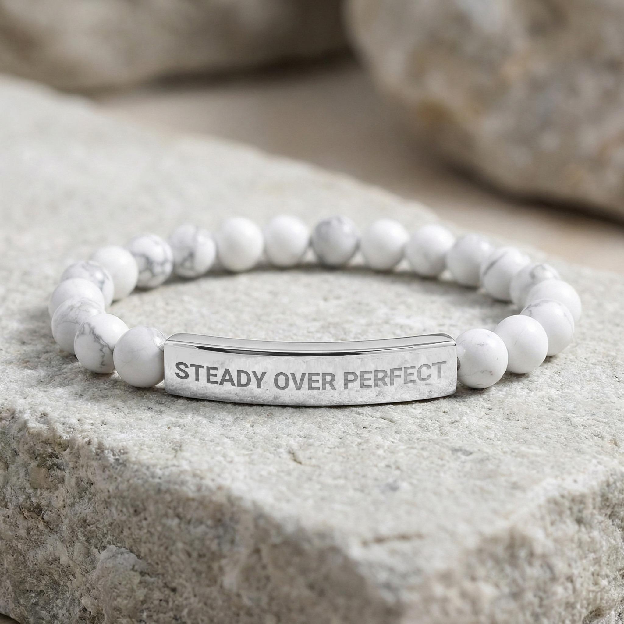 Empower yourself or a loved one with this custom engraved bracelet featuring the inspirational quote "Steady Over Perfect" - the perfect motivational jewelry for anyone on a journey of self-improvement. This meaningful gift serves as a daily progress reminder, providing encouragement through its powerful message that celebrates steady growth over unattainable perfection.