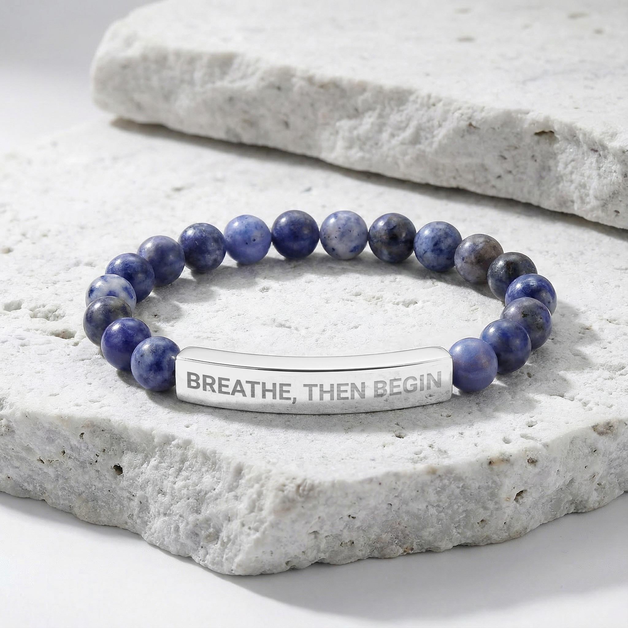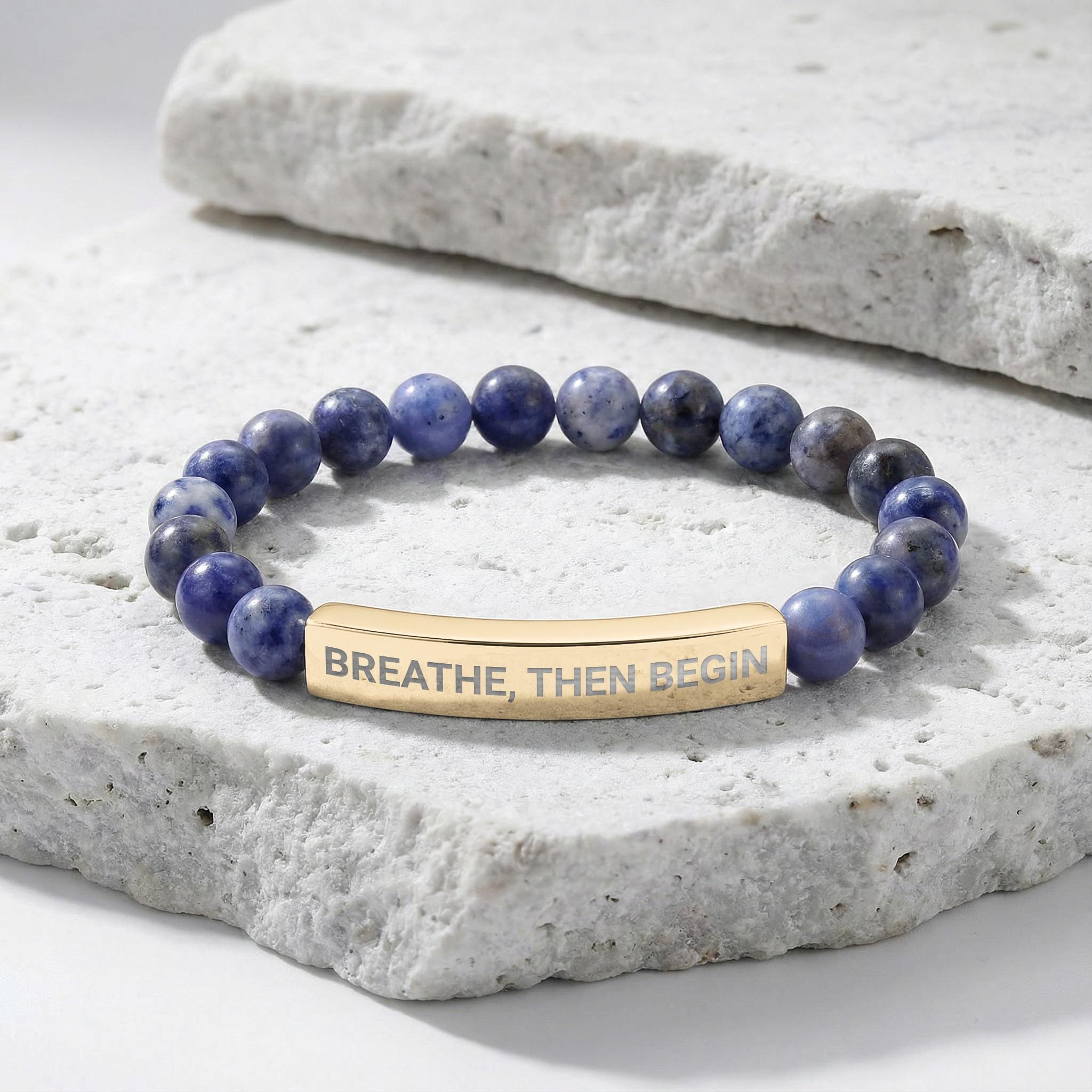 Design your own inspirational custom engraved bracelet! This bracelet features the phrase "Breathe, then Begin", but you can personalize it with your favorite mantra, quote, name, or a special date. Create a unique gift for yourself or a loved one that will serve as a daily reminder of their inner strength and potential.