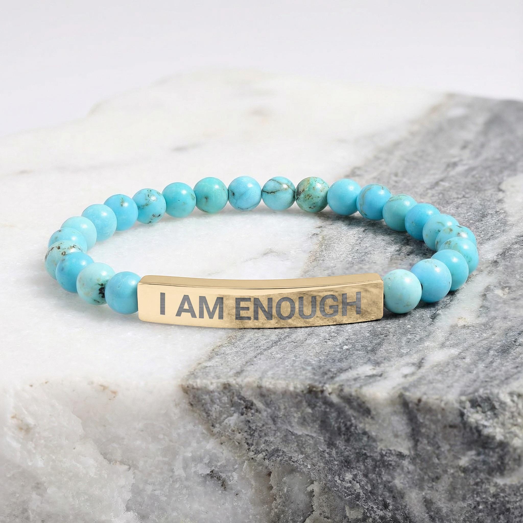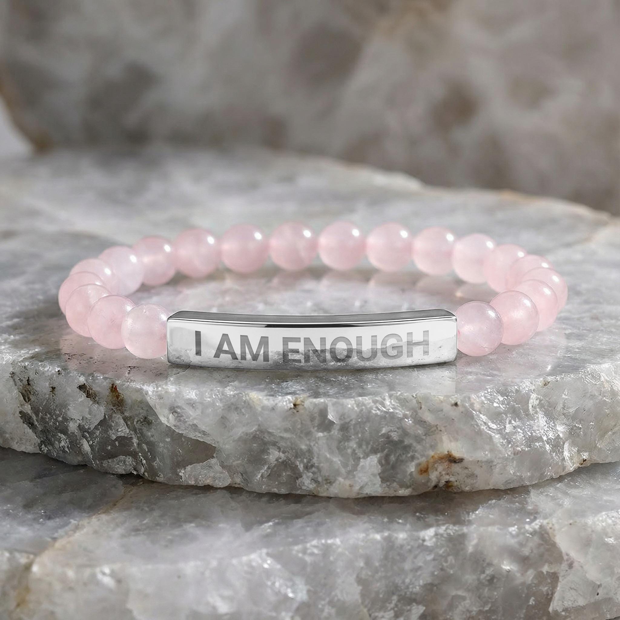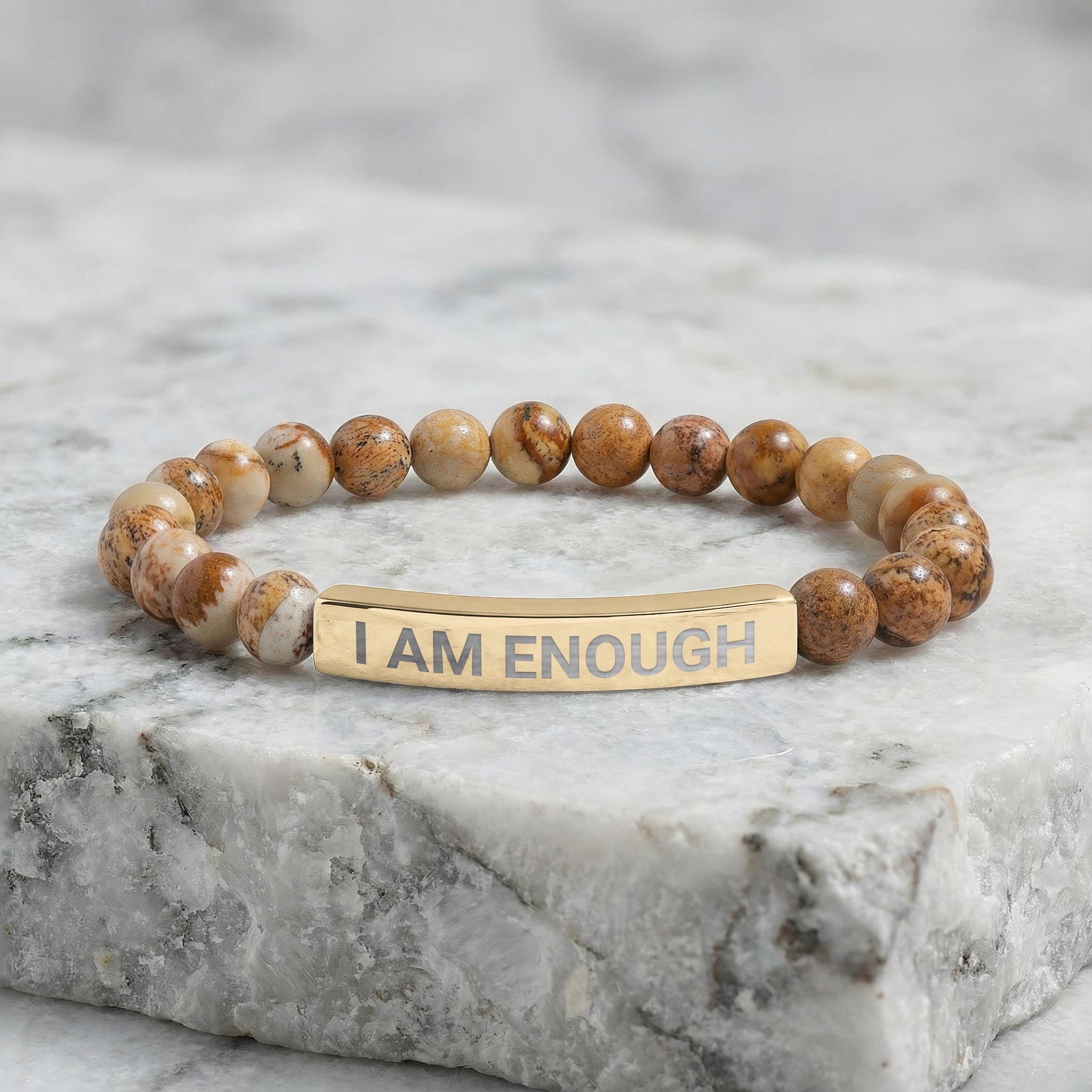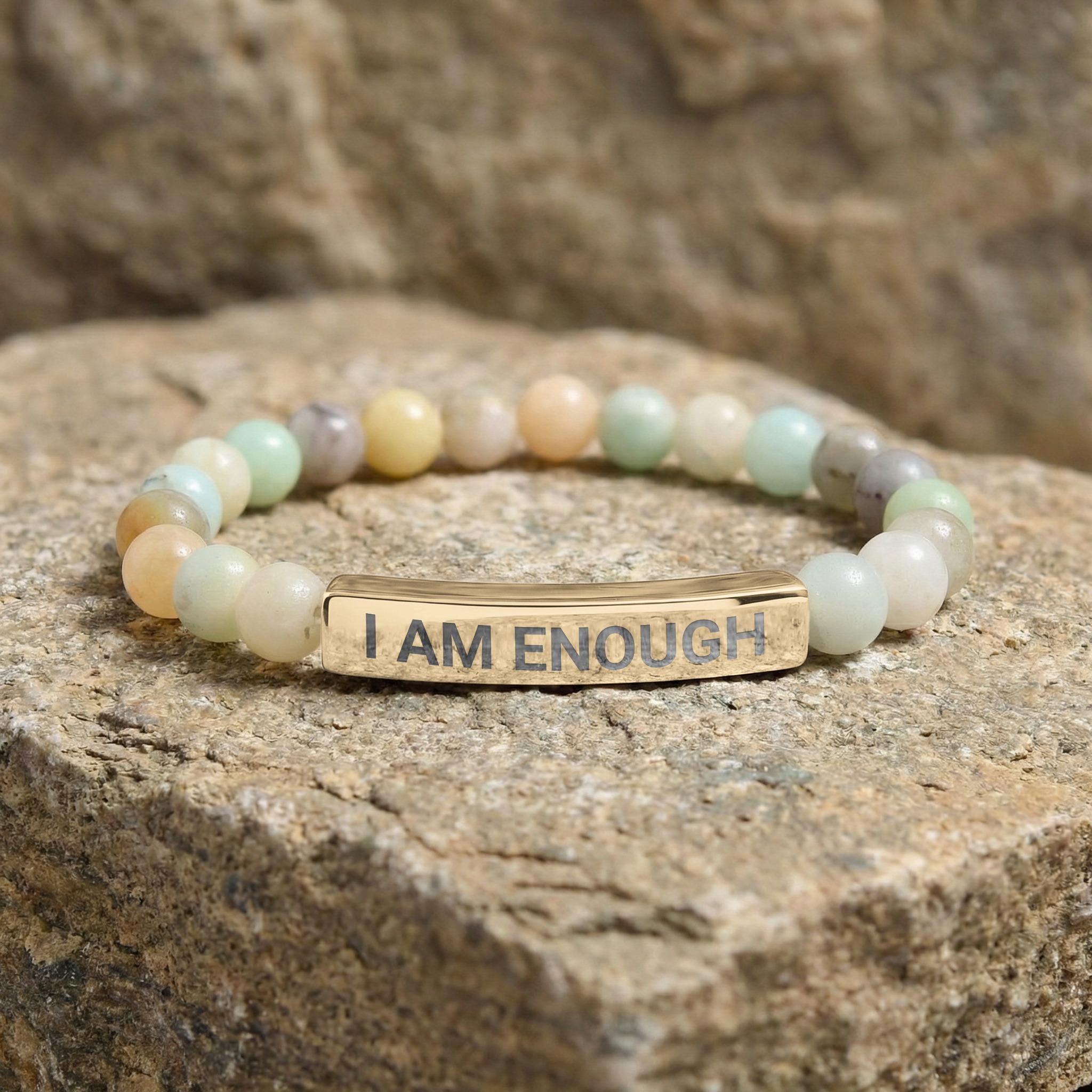 • Elegant cuff bangle featuring the empowering engraved phrase "I AM ENOUGH" or your custom personalized message