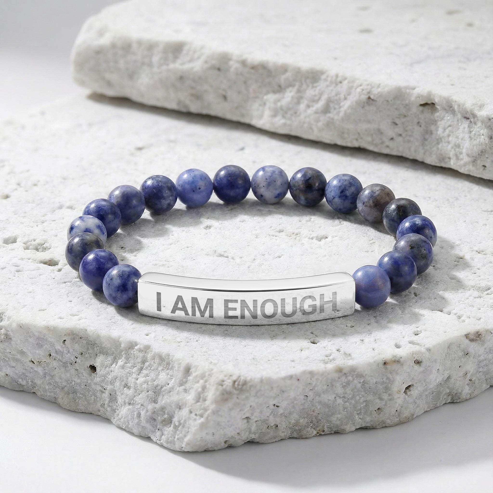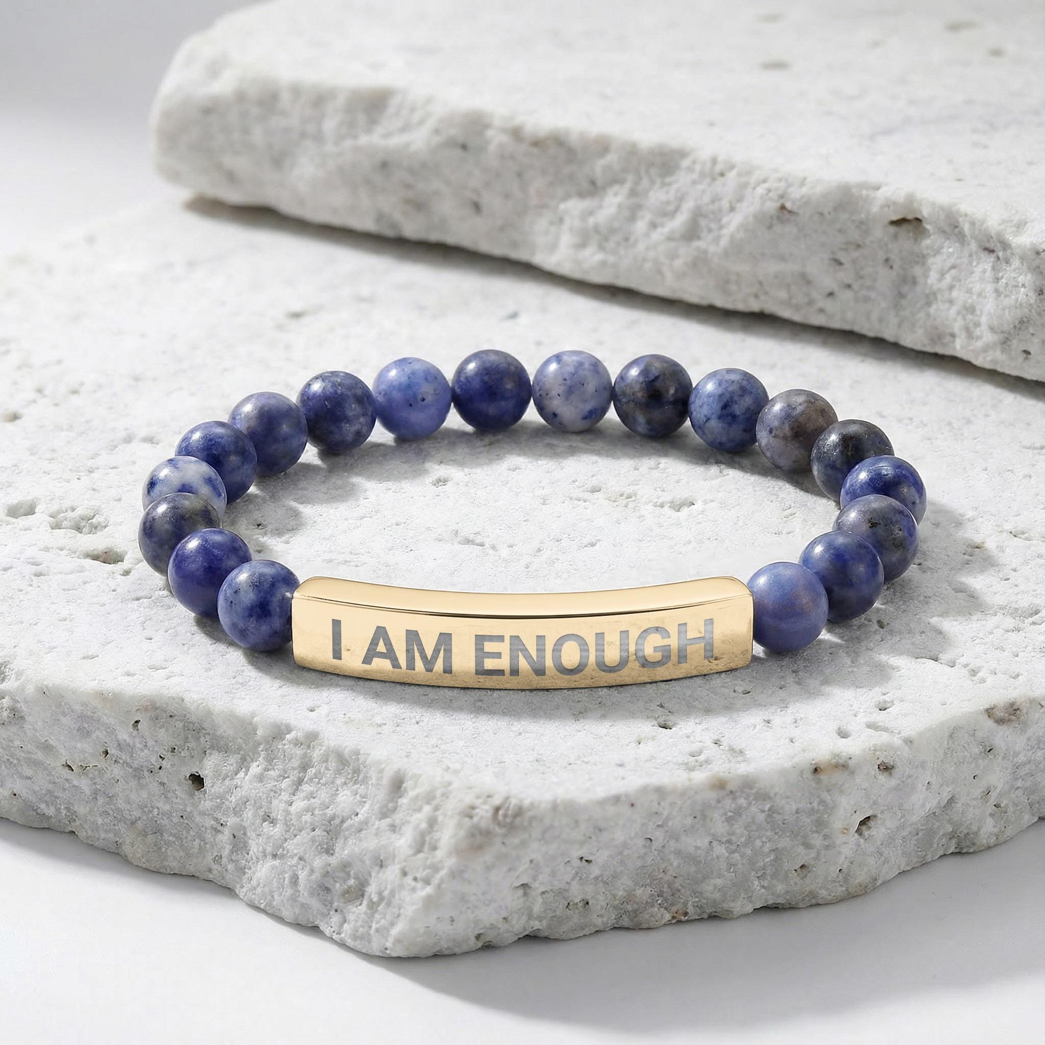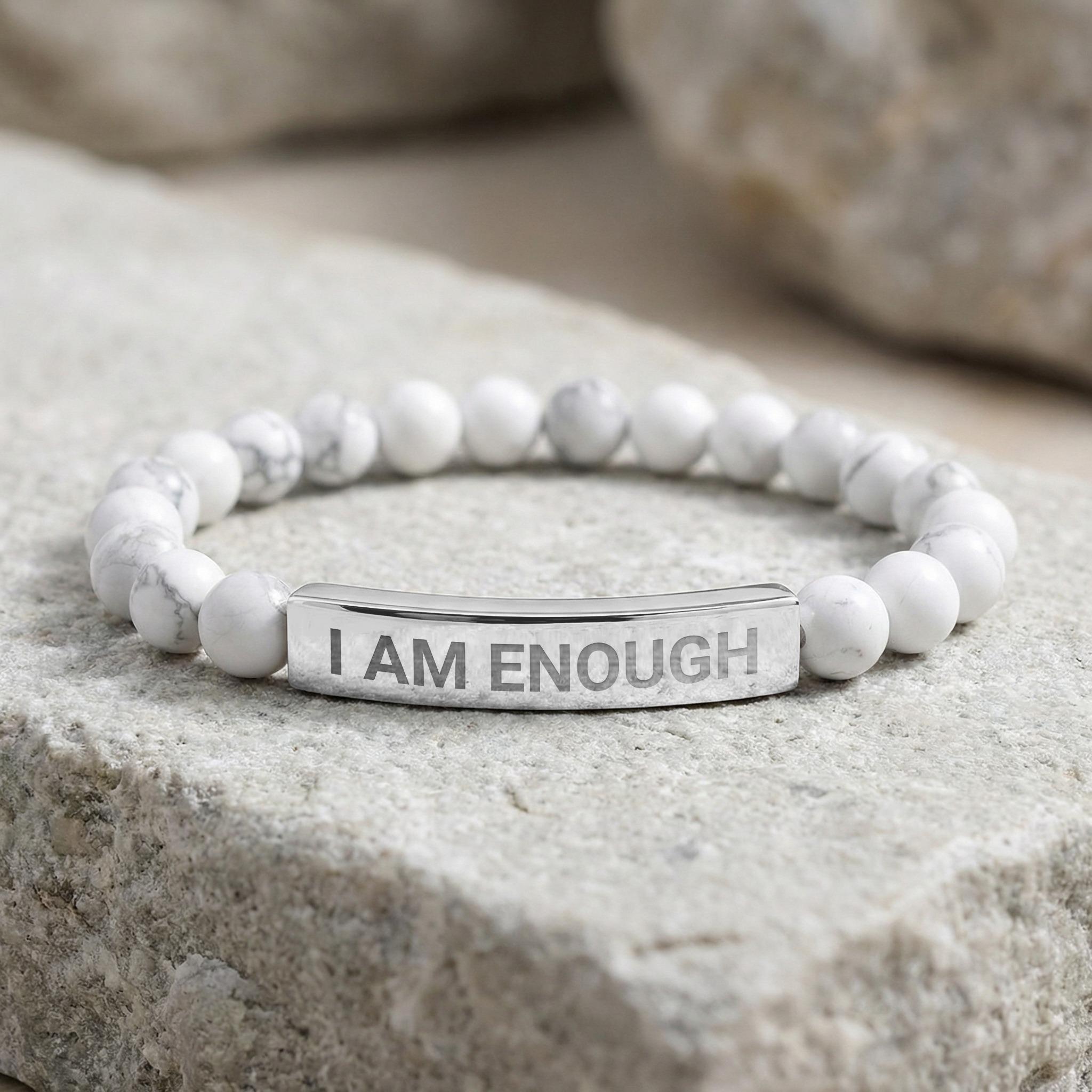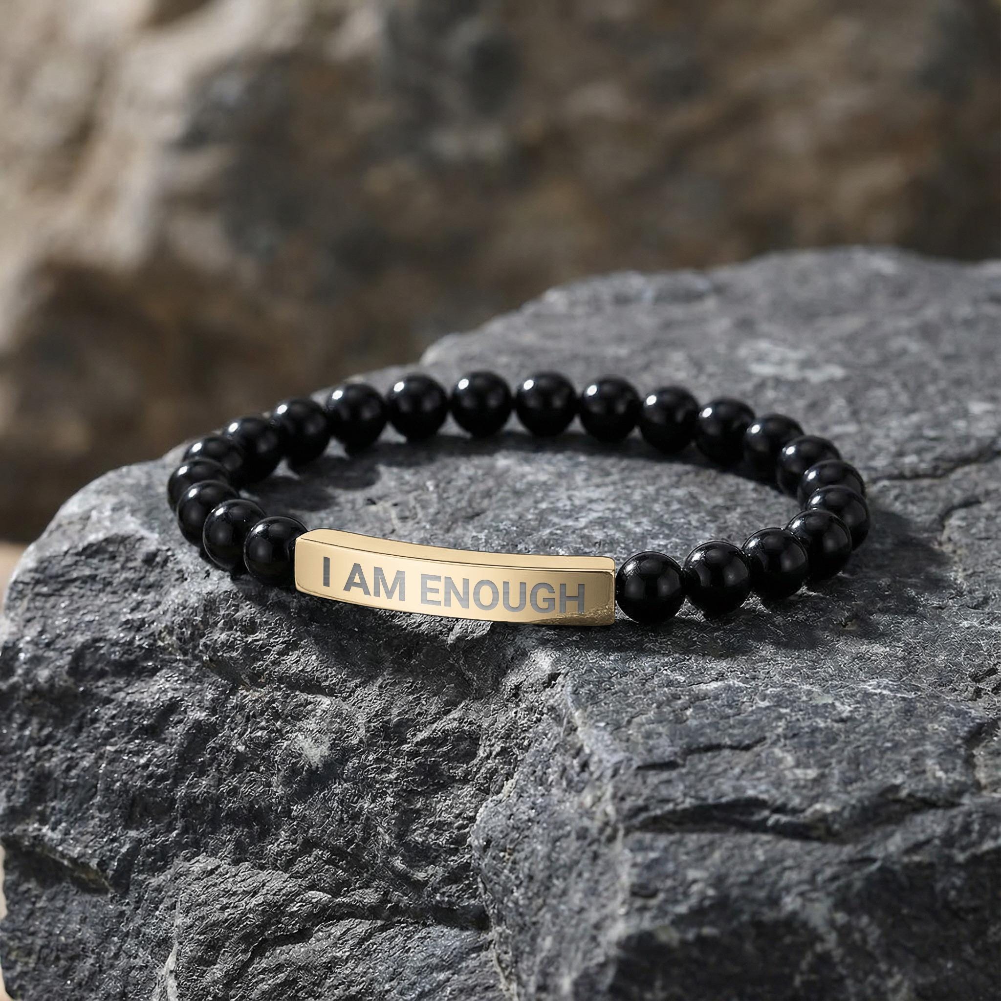 • Elegant cuff bangle featuring the empowering engraved phrase "I AM ENOUGH" or your custom personalized message