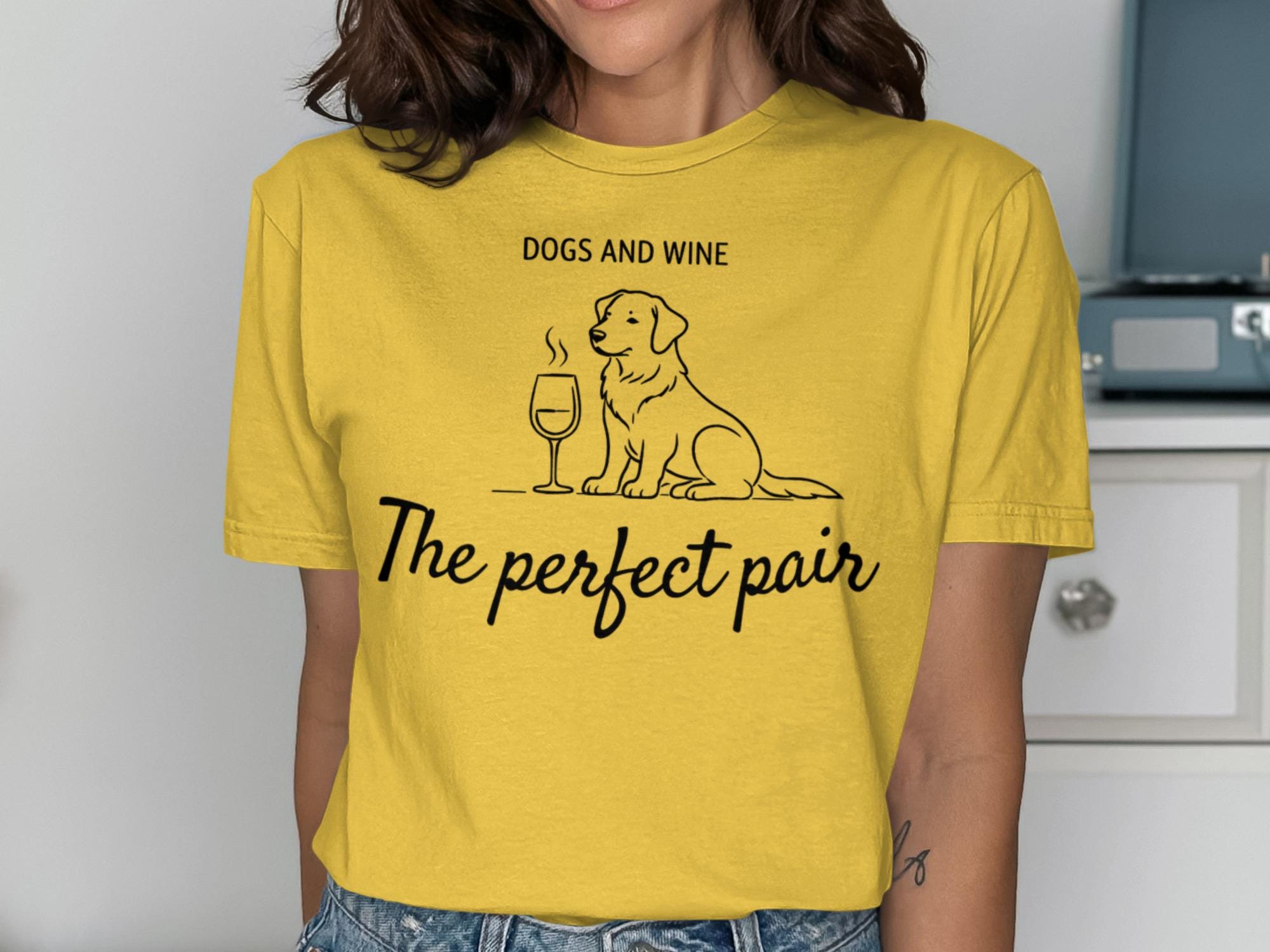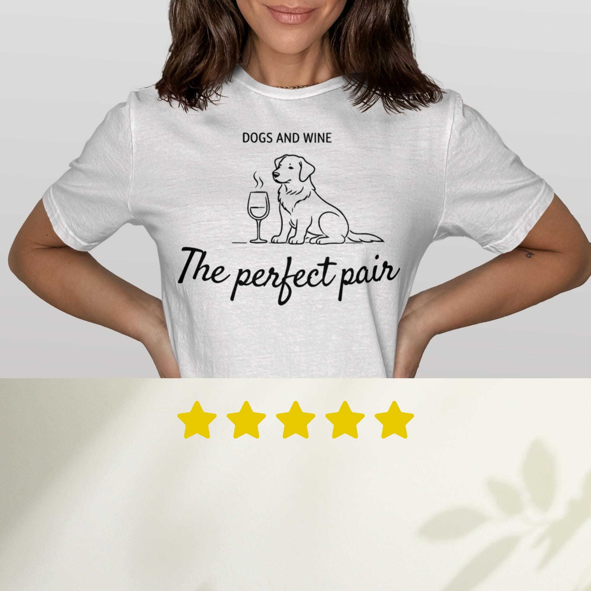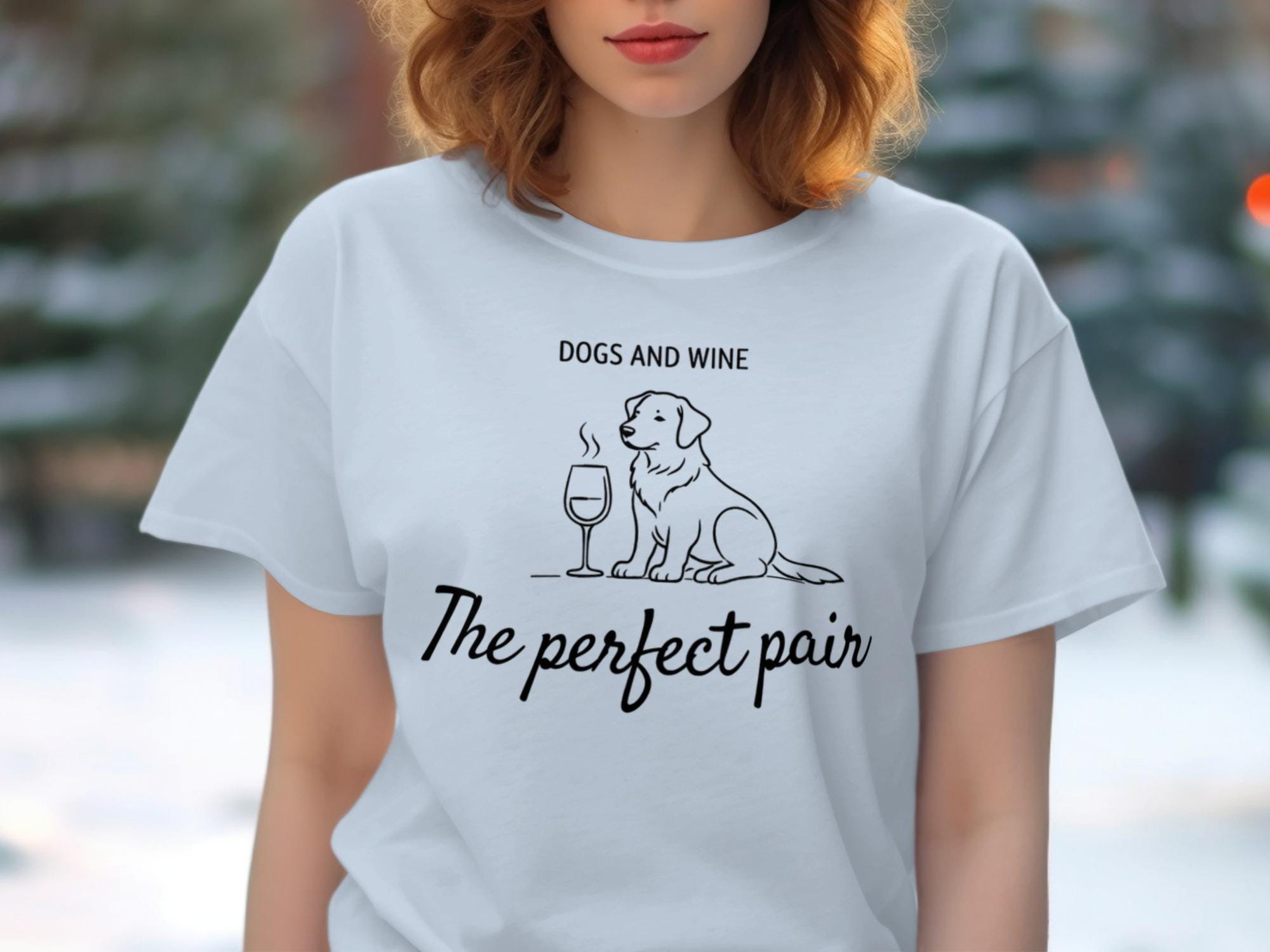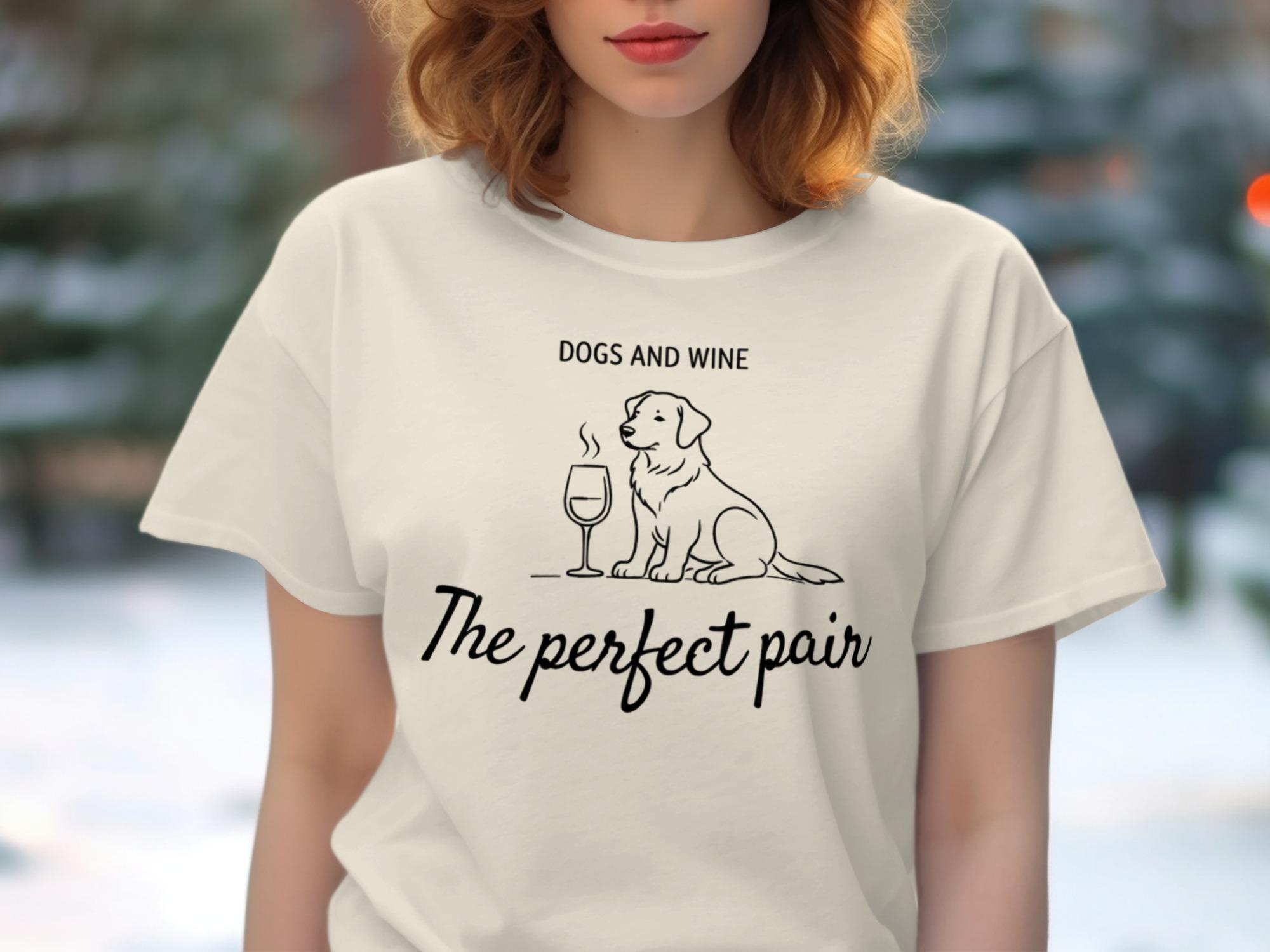 Celebrate the ultimate combination with our Dogs and Wine T-Shirt. This unique design features a charming Golden Retriever alongside a sophisticated wine glass, embodying the sentiment "Dogs and Wine: The perfect pair". It is an ideal piece for anyone who adores their canine companion and appreciates a good glass of wine. Show your passion for pets and fine beverages with this delightful T-Shirt. A wonderful gift for dog moms, dog dads, or any pet owner who enjoys a relaxing evening with their furry friend and a favorite drink.
