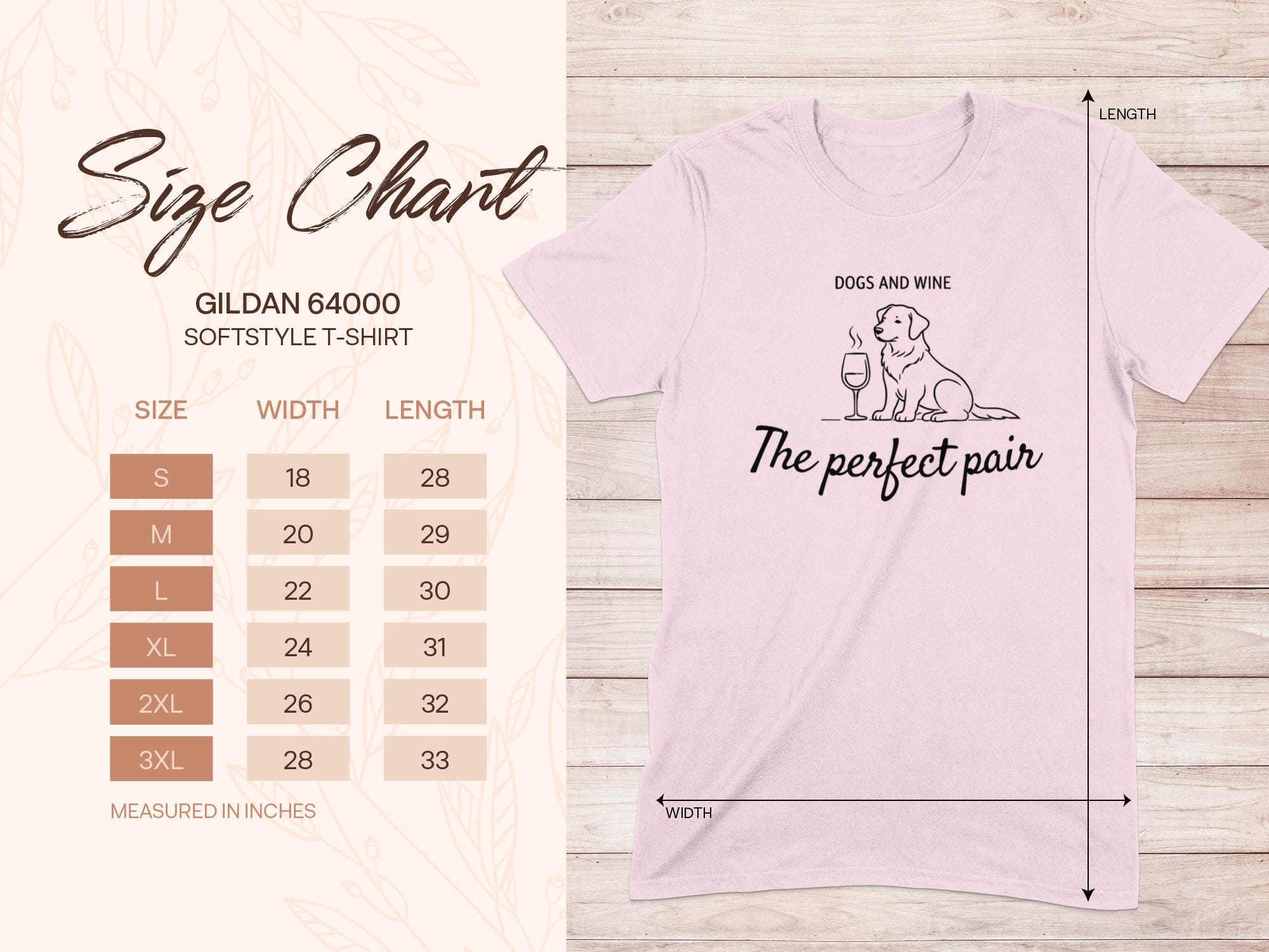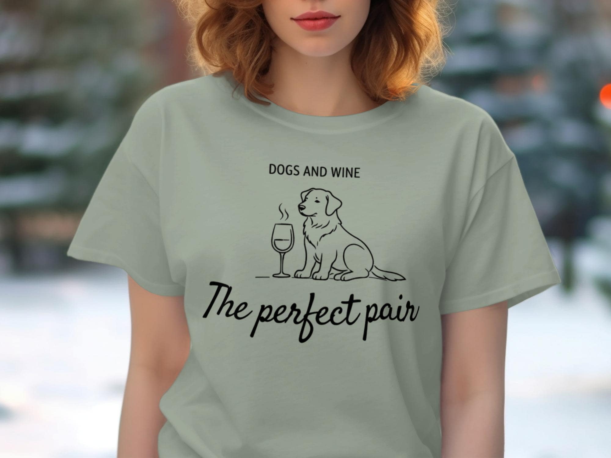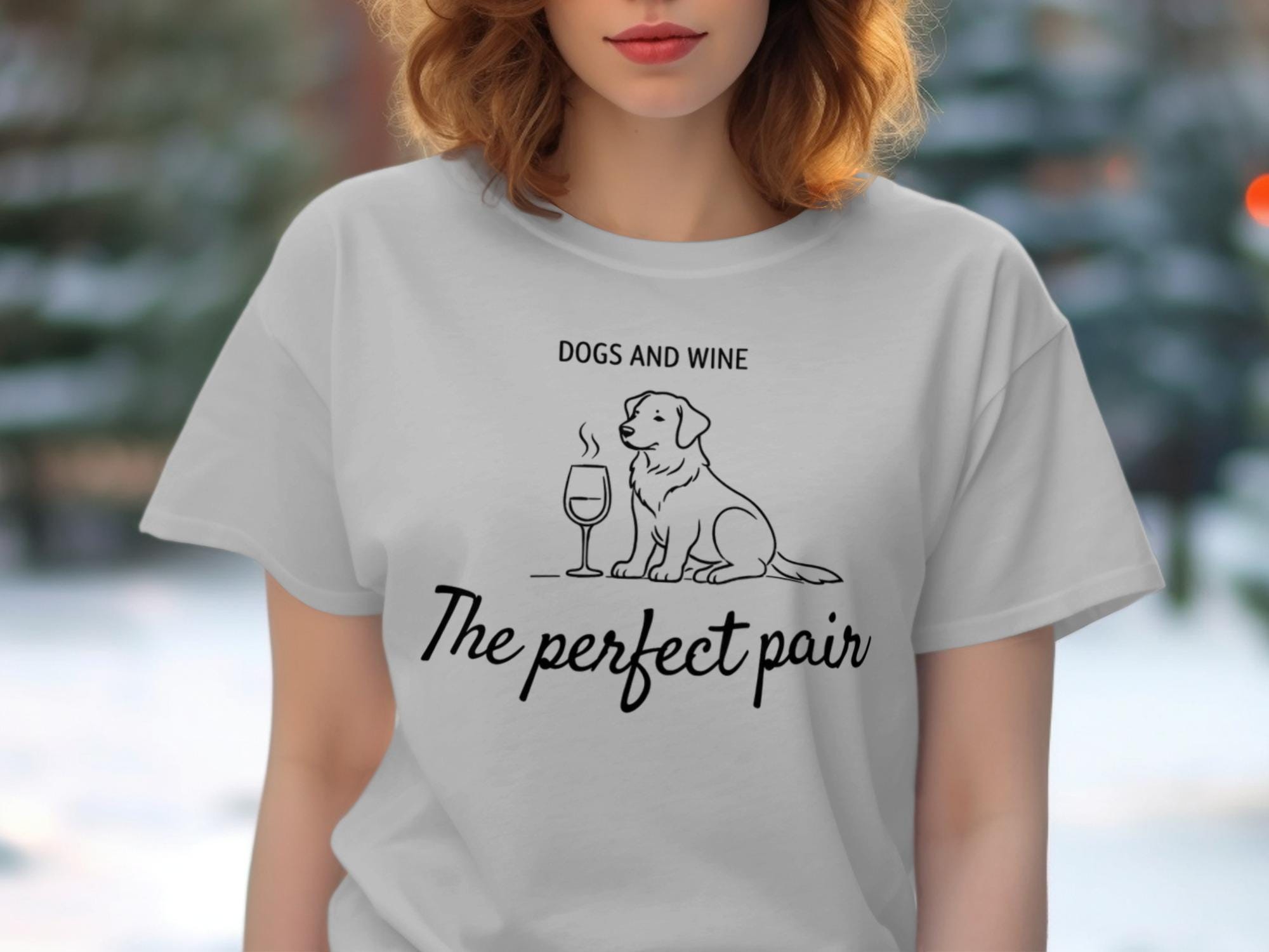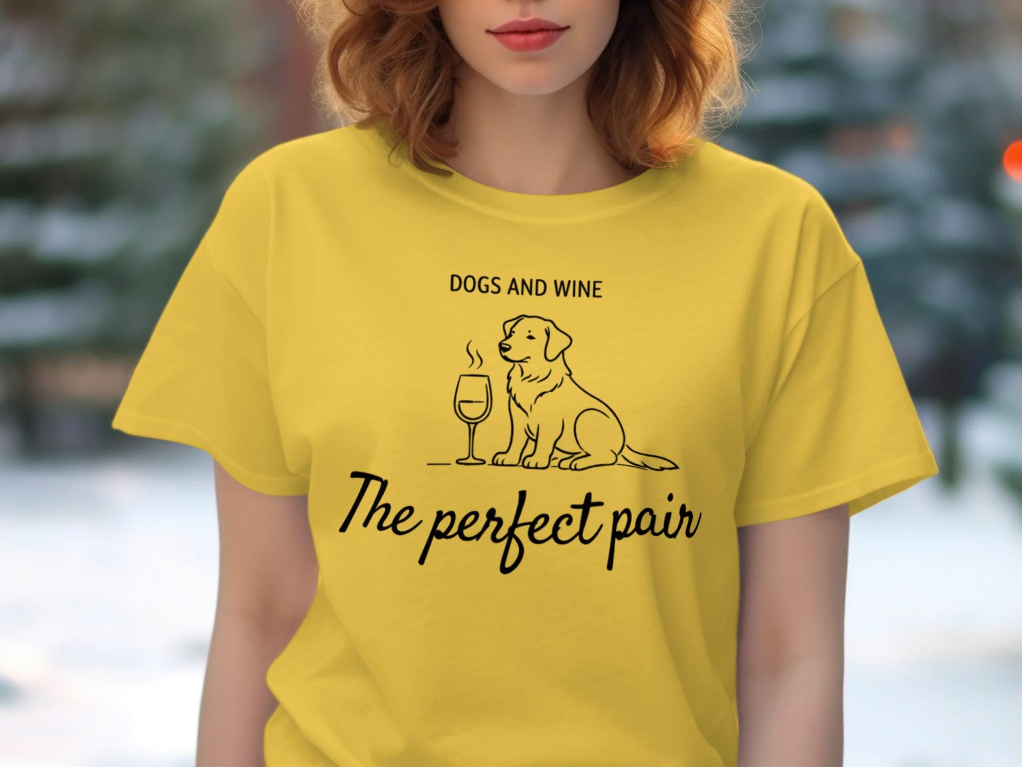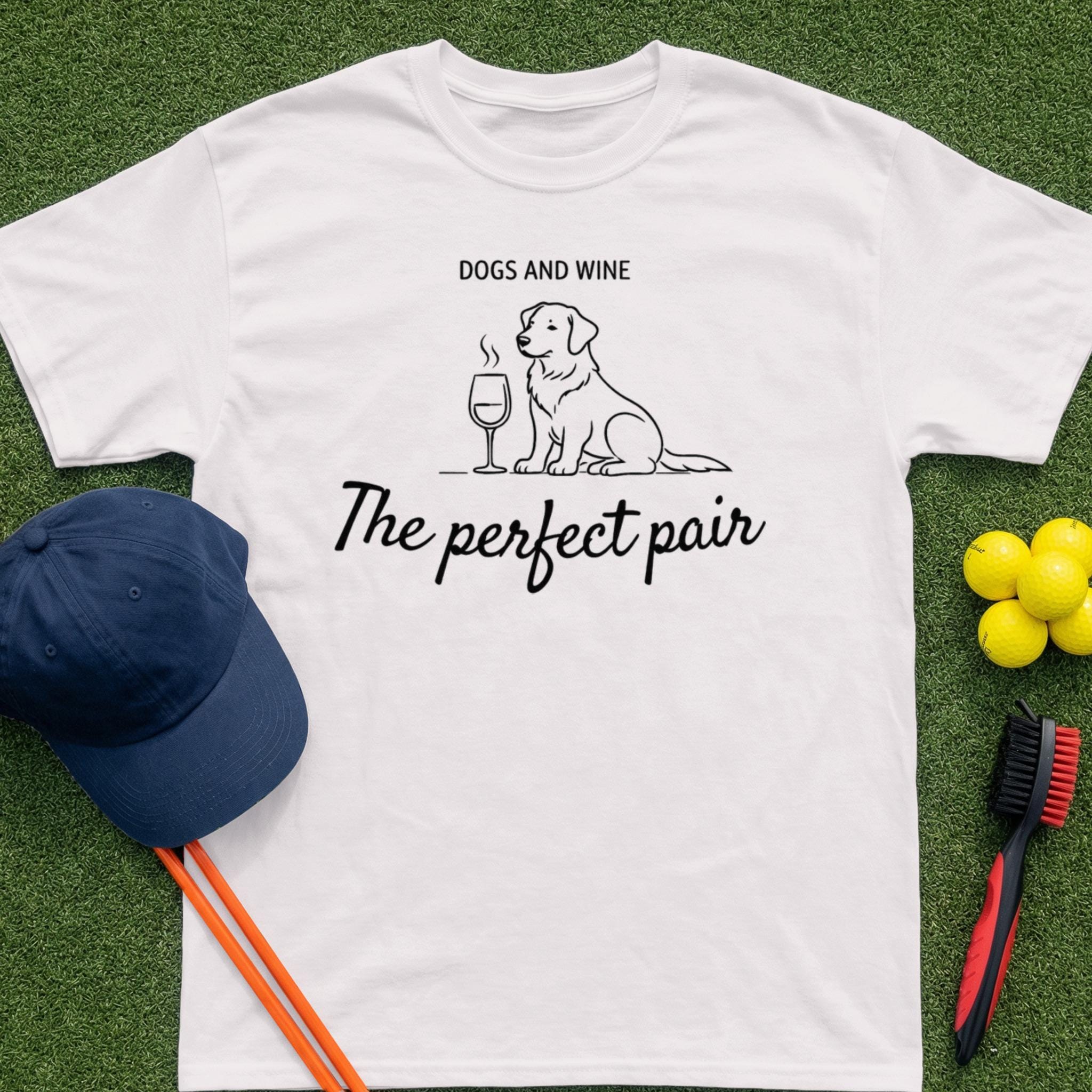 Celebrate the ultimate combination with our Dogs and Wine T-Shirt. This unique design features a charming Golden Retriever alongside a sophisticated wine glass, embodying the sentiment "Dogs and Wine: The perfect pair". It is an ideal piece for anyone who adores their canine companion and appreciates a good glass of wine. Show your passion for pets and fine beverages with this delightful T-Shirt. A wonderful gift for dog moms, dog dads, or any pet owner who enjoys a relaxing evening with their furry friend and a favorite drink.
