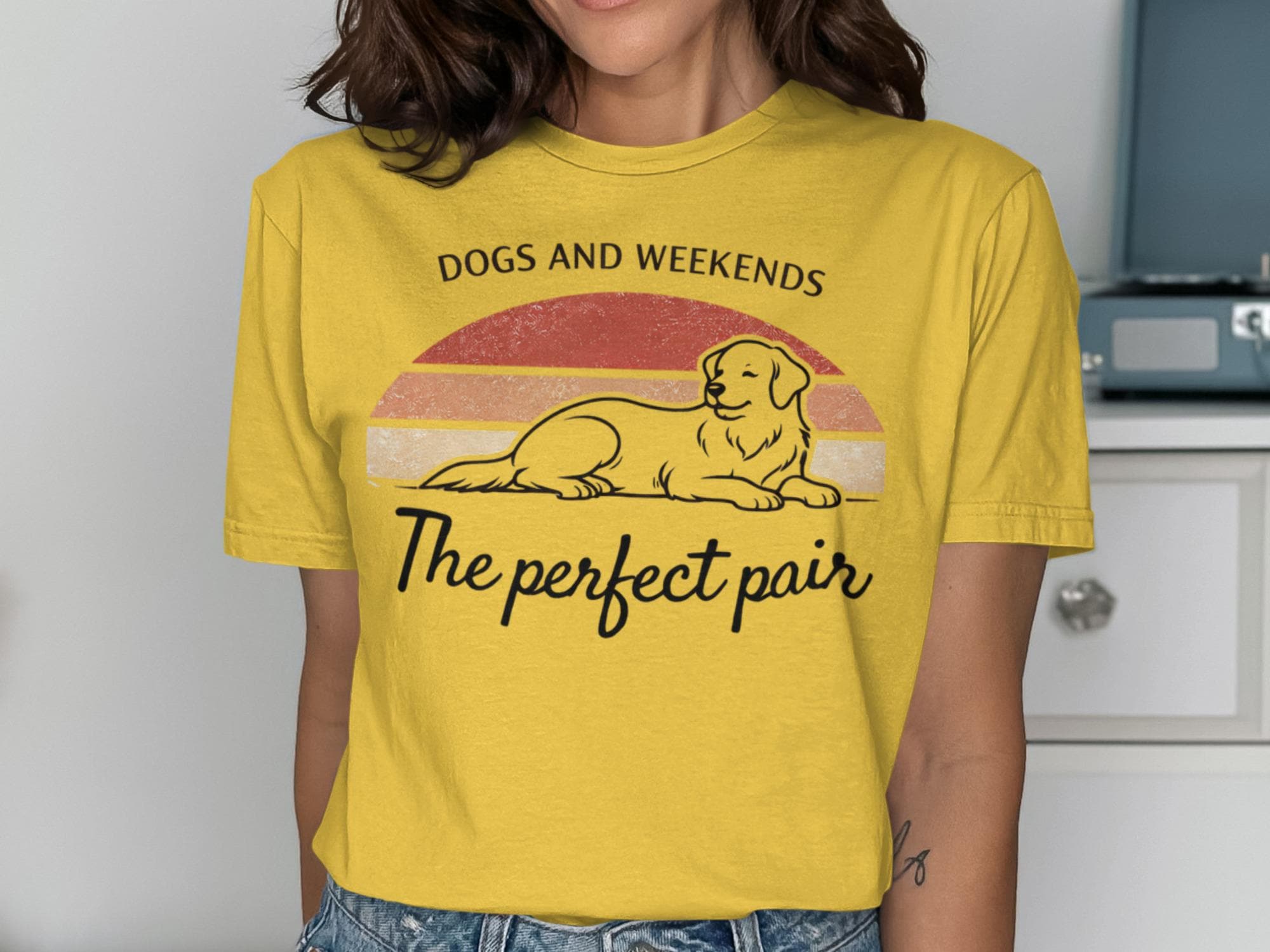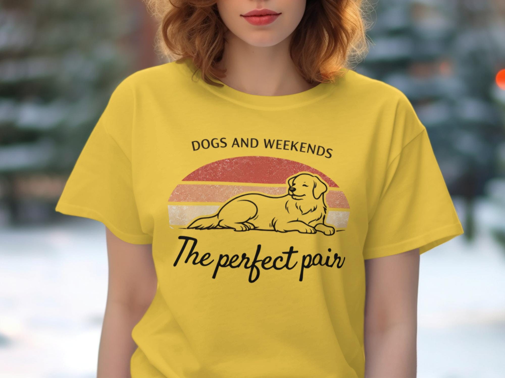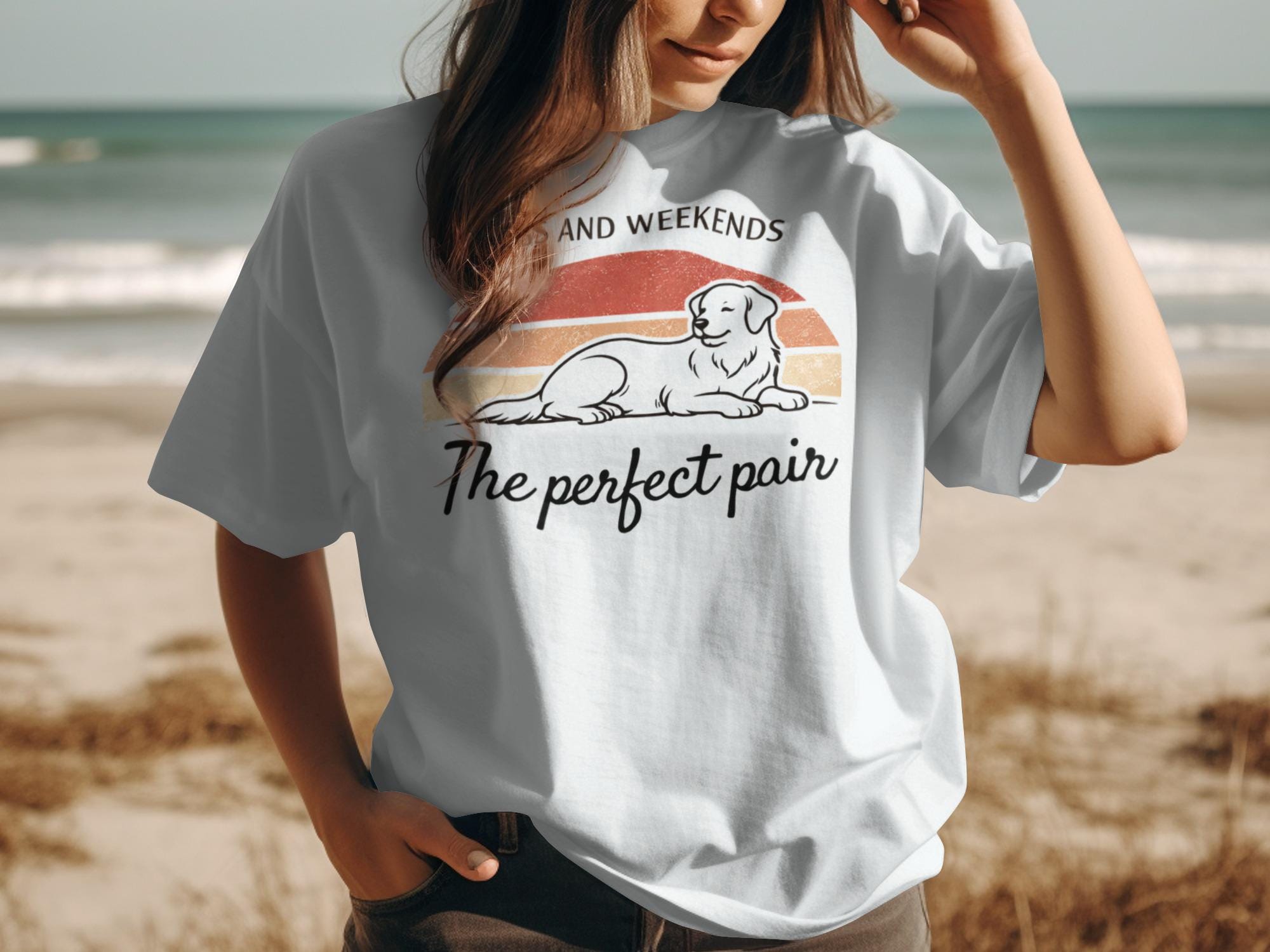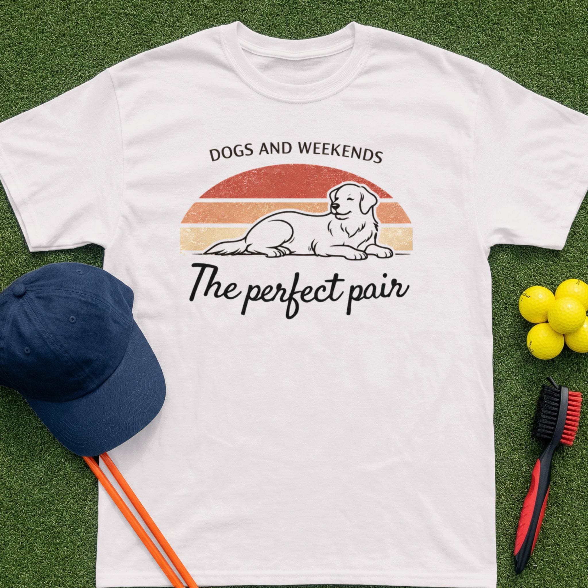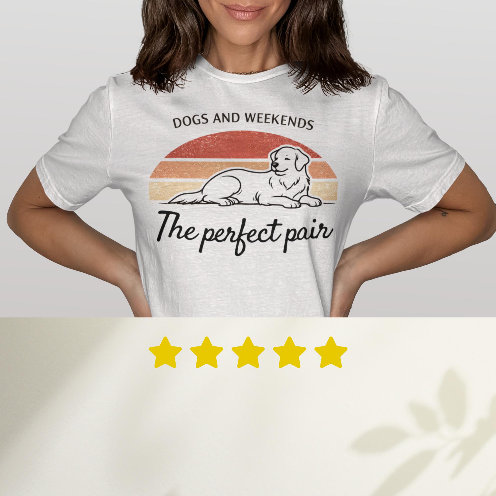 Celebrate the ultimate combination of joy and relaxation with our Dogs And Weekends The Perfect Pair Golden Retriever T-Shirt. This unique design features a happy, relaxed Golden Retriever set against a retro vintage sunset backdrop, beautifully encapsulating the bliss of spending quality time with your beloved canine companion. It is the ideal tee for any dog mom, dog dad, or pet owner who cherishes those precious weekend moments with their furry best friend. Perfect for casual outings, dog park visits, or simply lounging at home, this shirt is a wonderful way to express your passion for dogs and leisure. A thoughtful gift for birthdays, holidays, or just because, ensuring smiles for any Golden Retriever enthusiast.