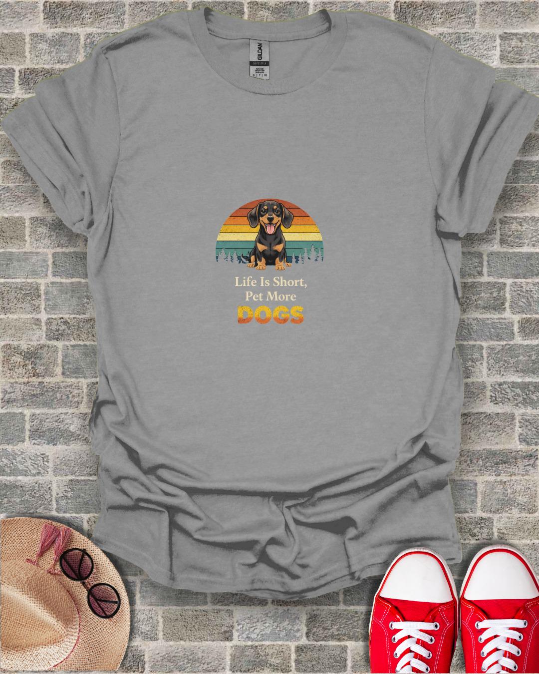 Celebrate your love for dogs with our charming Dachshund Dog T-Shirt, a perfect blend of retro style and heartwarming sentiment. This T-Shirt features an adorable Dachshund puppy smiling brightly, illustrated against a distressed vintage sunset background. The vibrant, striped backdrop, accented with subtle pine tree silhouettes, creates a nostalgic and appealing aesthetic. The inspiring quote "Life Is Short, Pet More DOGS" is prominently displayed, making this T-Shirt a clear declaration of your passion for pets. Ideal for Dachshund moms, Doxie dads, or any dog lover, this graphic T-Shirt is a wonderful way to express affection for your furry best friends. It makes a thoughtful gift for birthdays, holidays, or simply a special treat for yourself.