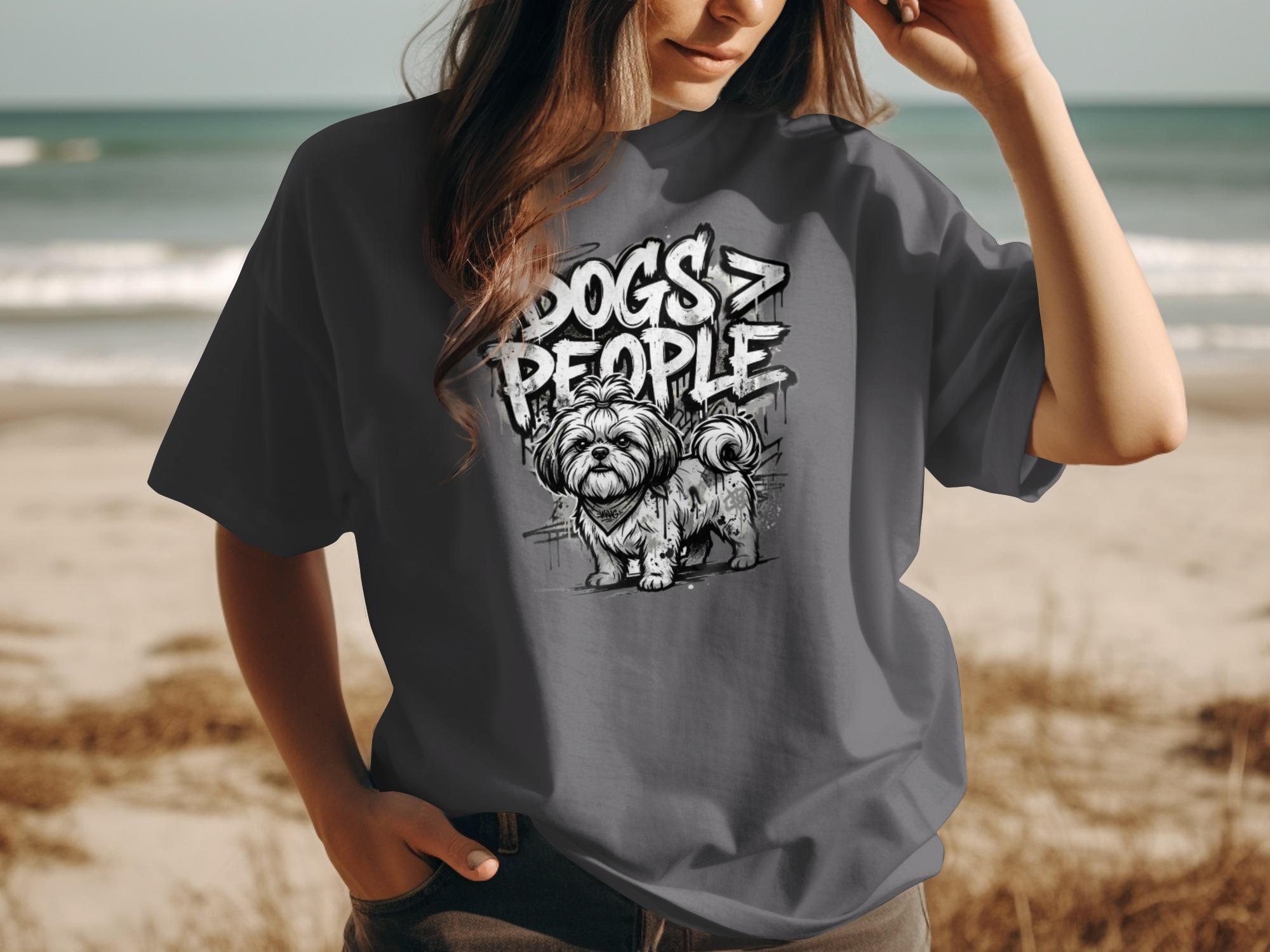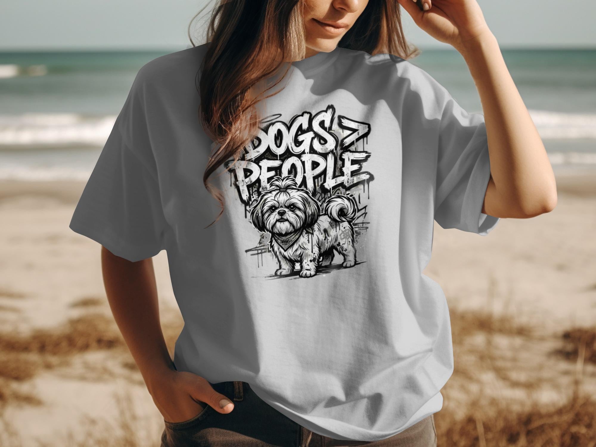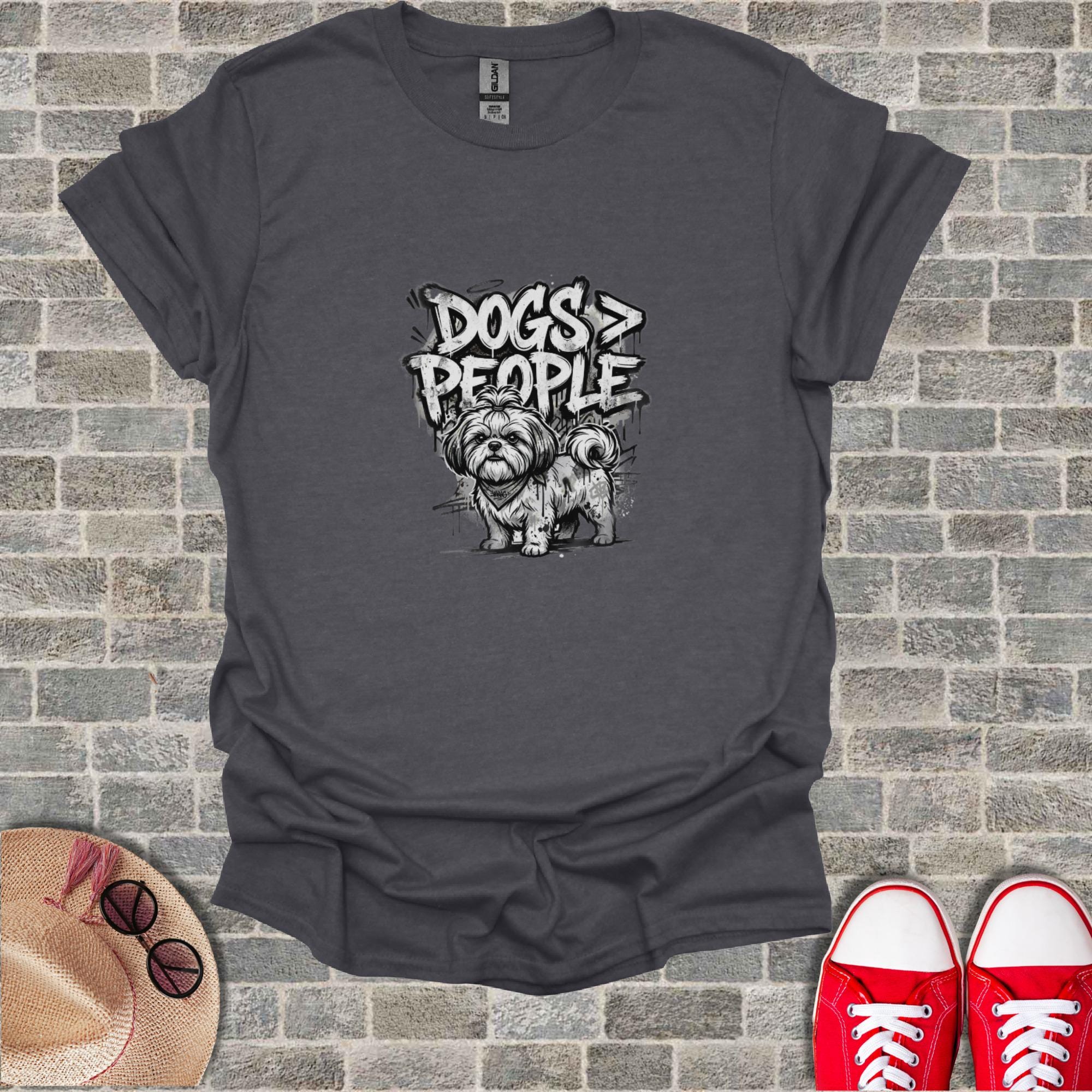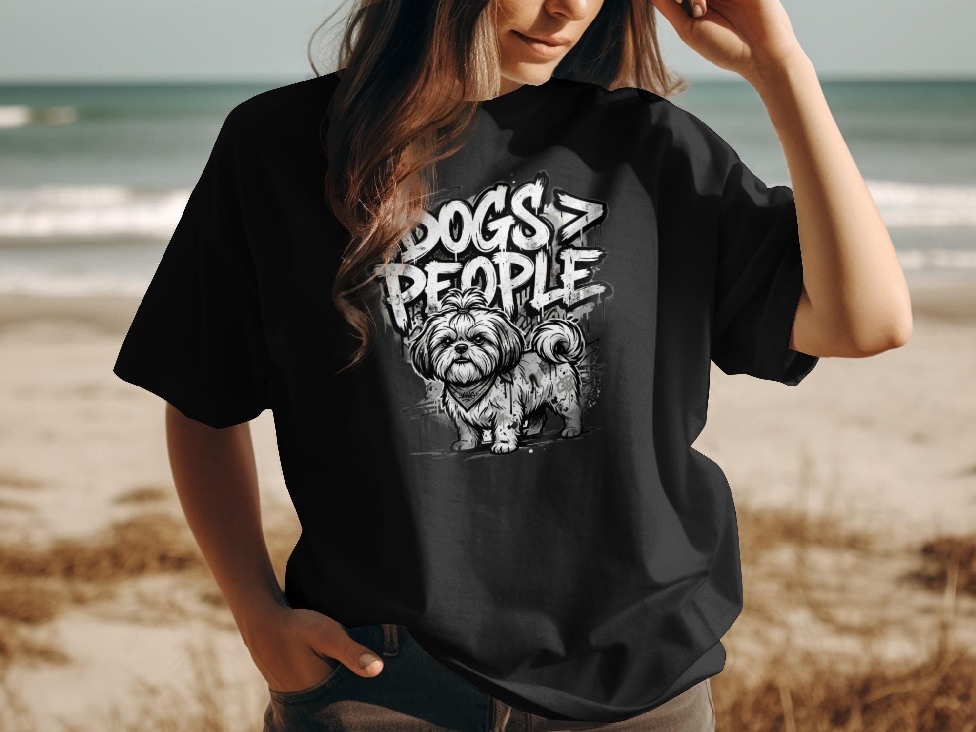 Express your true feelings with our bold "Dogs > People" T-Shirt, featuring an adorable Shih Tzu in a cool graffiti art style. This unique graphic tee is perfect for any dog enthusiast who understands the special bond with their furry friend. The striking black and white design with its edgy aesthetic makes a clear statement wherever you go, celebrating canine companionship with a touch of street art flair. It's an ideal choice for everyday wear, dog park visits, or as a thoughtful present for a fellow dog lover.