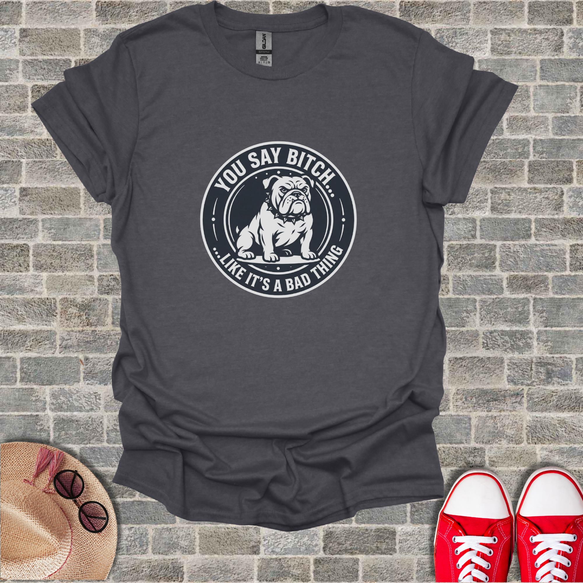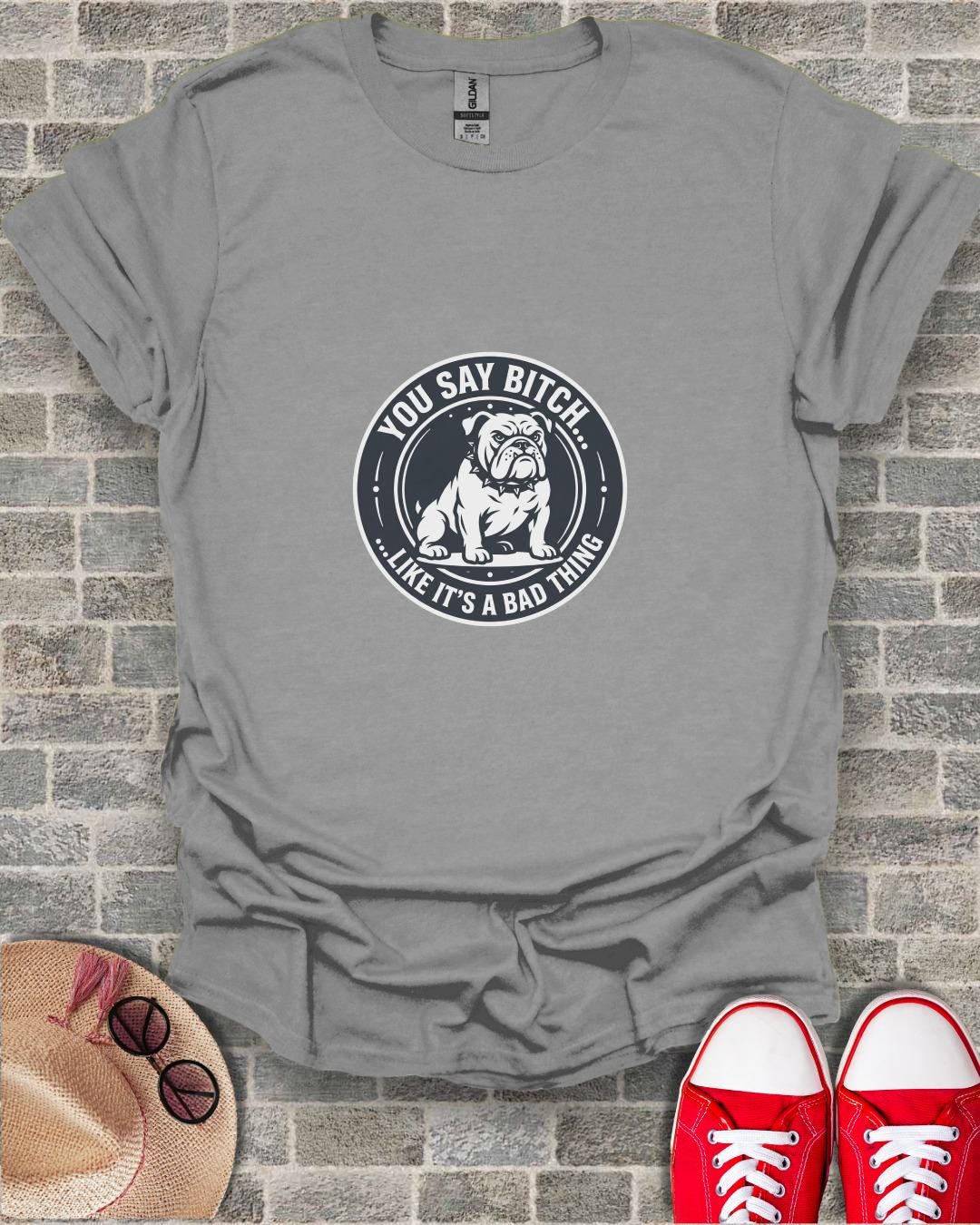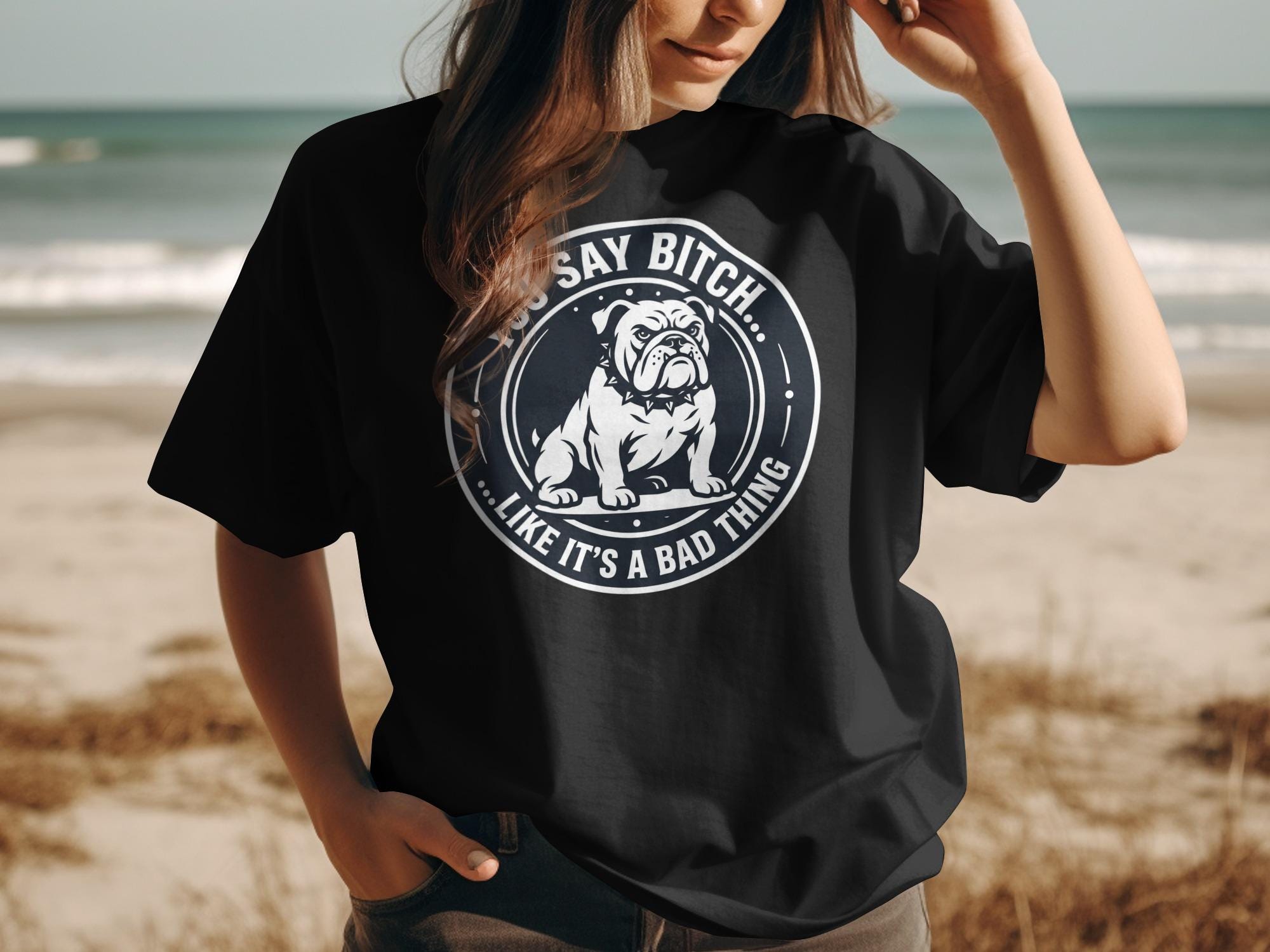 Make a bold statement with this unique Bulldog T-Shirt, featuring the assertive quote "You Say Bitch... Like It's A Bad Thing". This design perfectly captures a no-nonsense attitude, ideal for those who appreciate sharp wit and a touch of rebellious spirit. Celebrate your love for bulldogs and distinctive humor with this eye-catching graphic tee. It's a fantastic conversation starter and a testament to individuality.