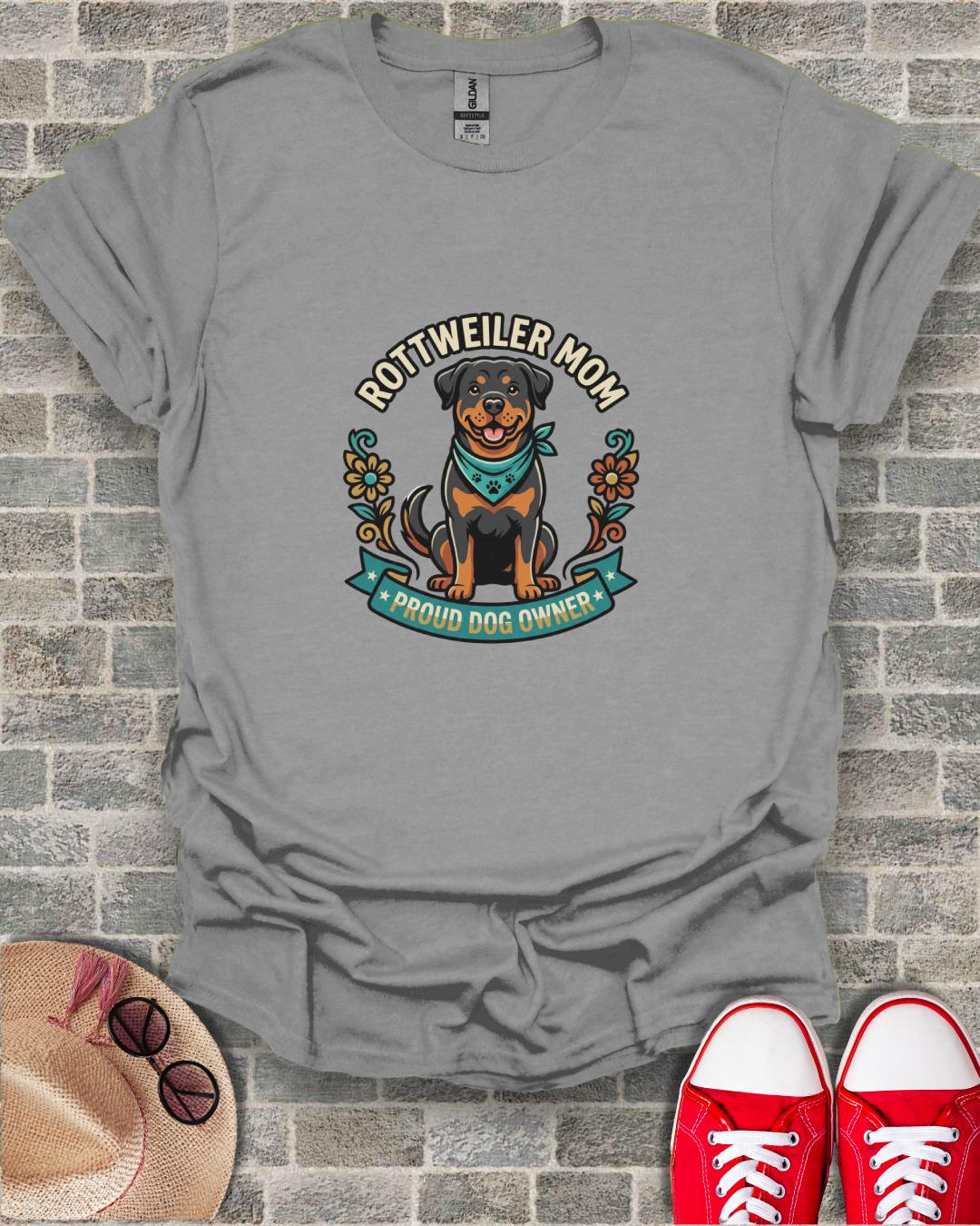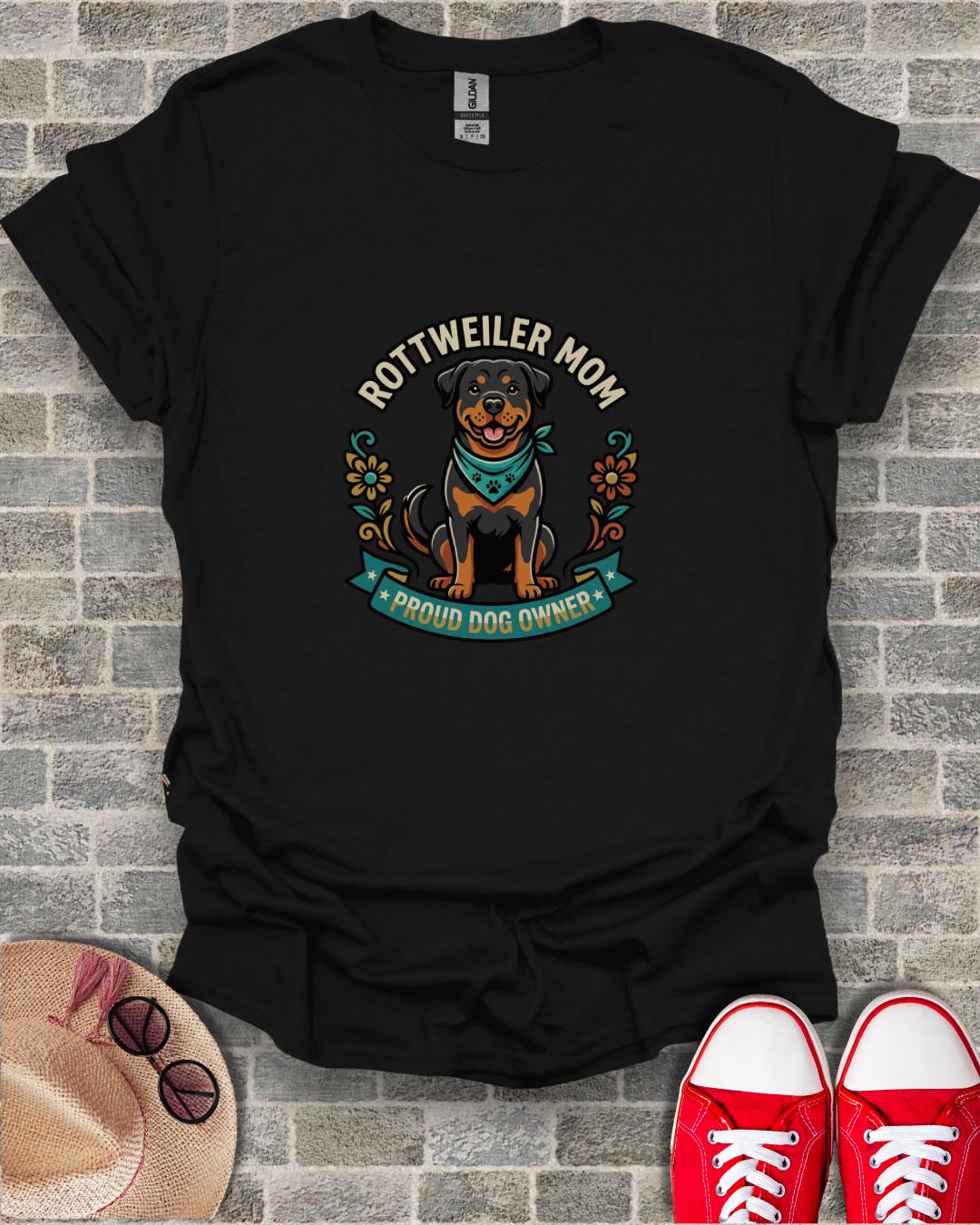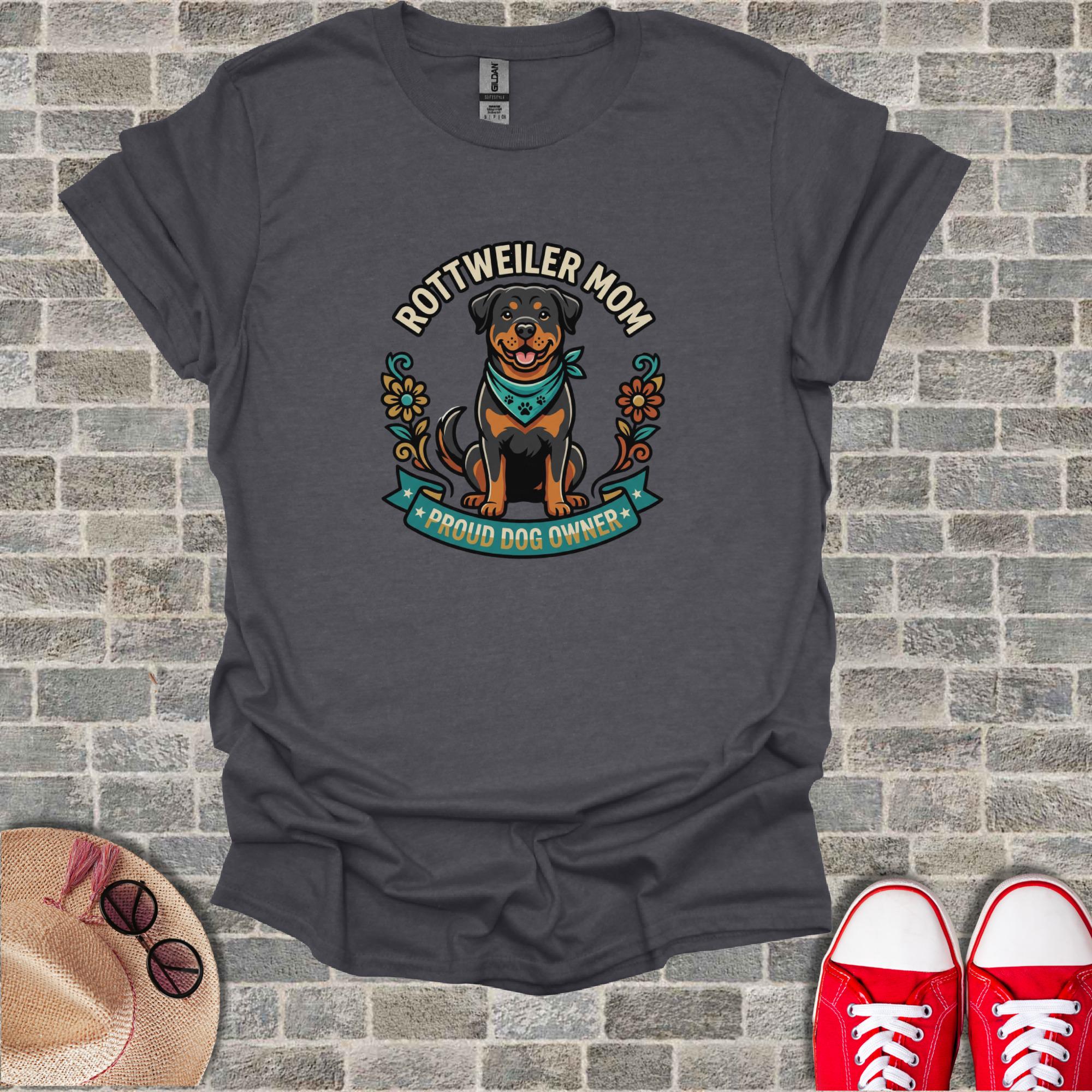 Celebrate your love for your furry best friend with this adorable Rottweiler Mom T-Shirt. Featuring a charming, happy Rottweiler wearing a paw print bandana, framed by elegant floral accents, and proudly declaring "Rottweiler Mom" and "Proud Dog Owner", this T-Shirt is a must-have for any Rottie enthusiast. It captures the joy and pride of being a dog parent, making it an ideal expression of your canine devotion. Perfect for casual outings, dog park visits, or simply relaxing at home, this unique design stands out and spreads smiles.