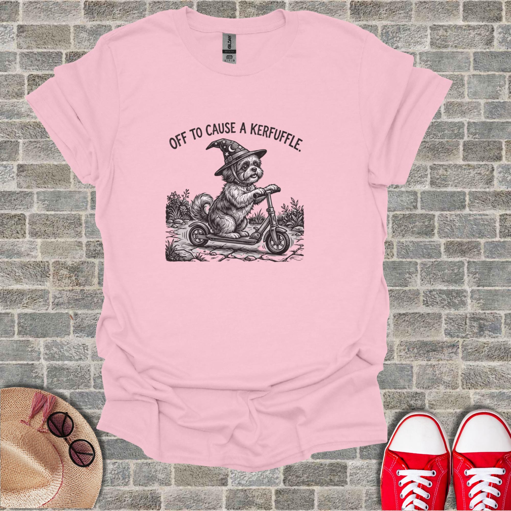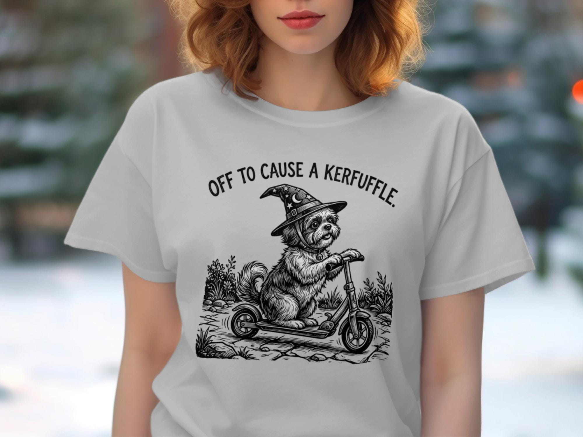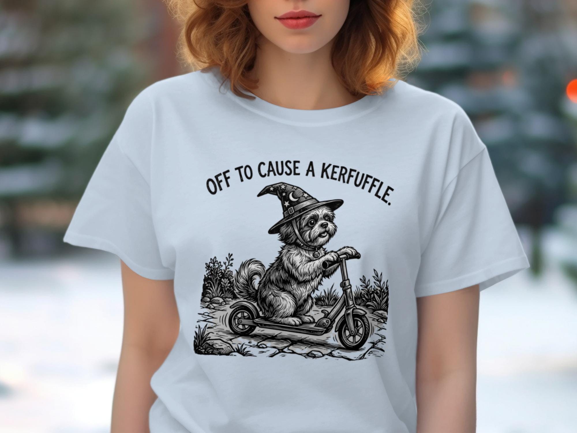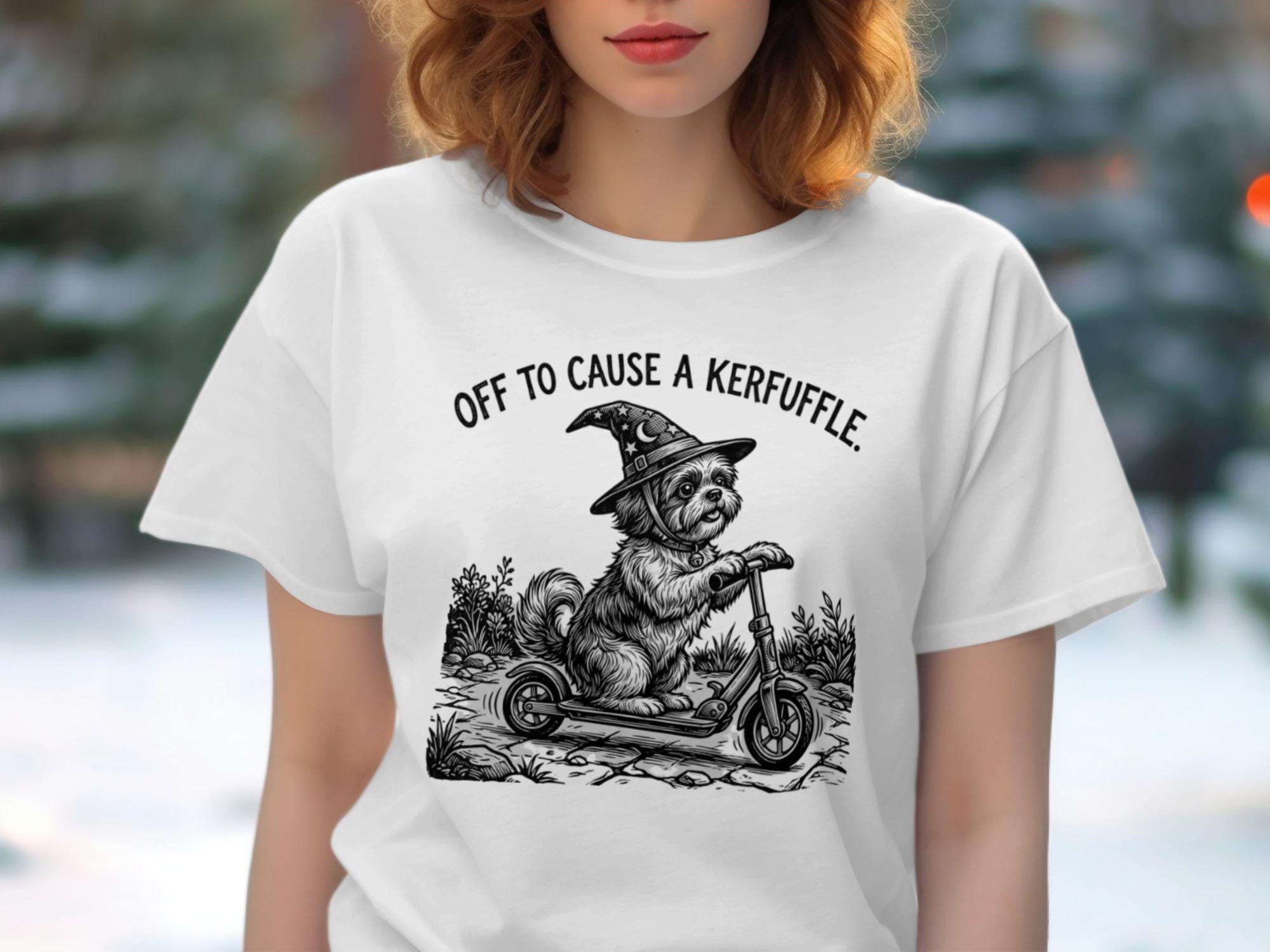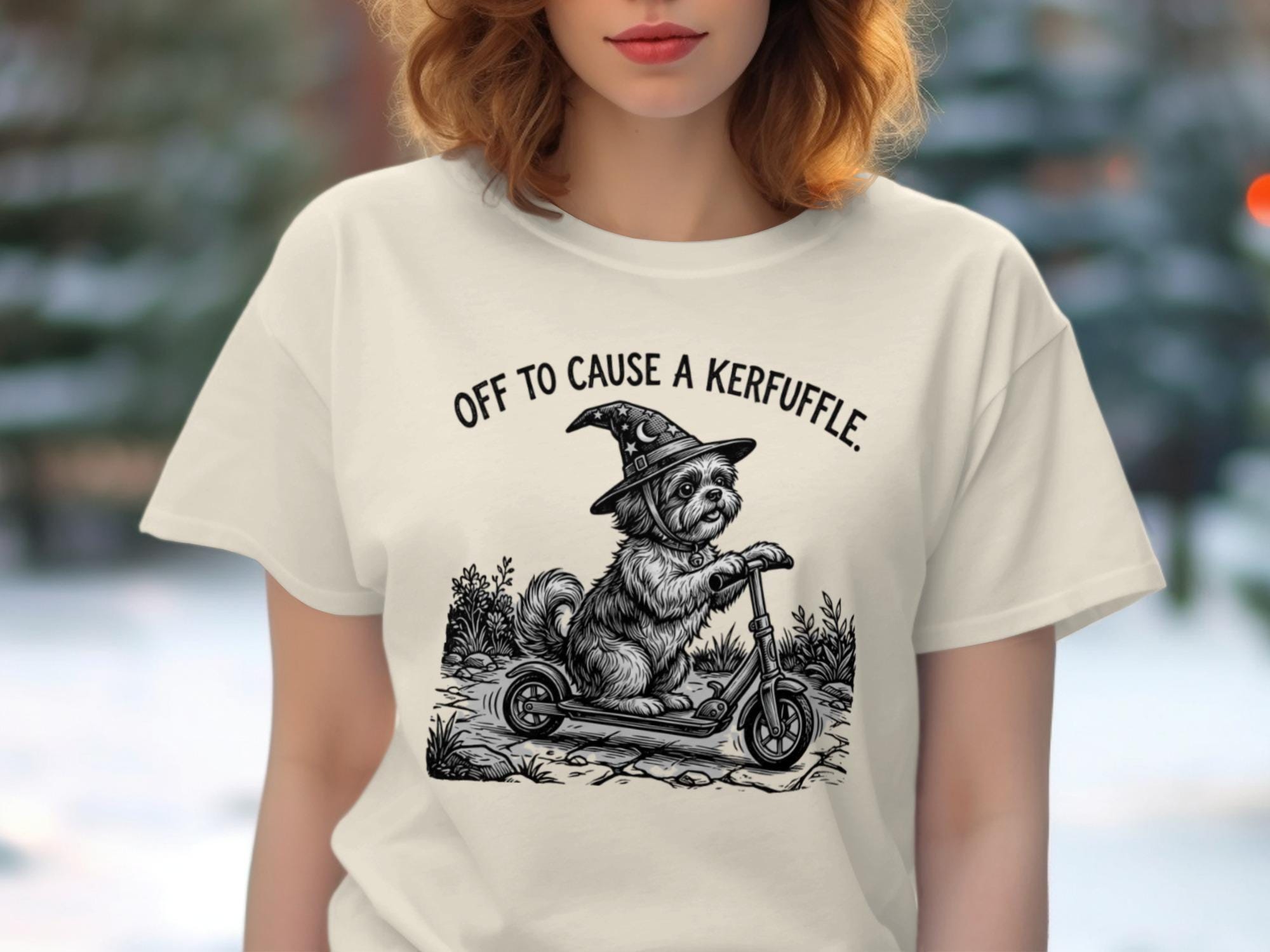 Embark on a magical and mischievous adventure with our exclusive "Off To Cause A Kerfuffle" T-Shirt. This captivating design showcases an irresistibly cute, fluffy dog, possibly a Shih Tzu or Lhasa Apso, wearing a whimsical wizard hat adorned with stars and a crescent moon. The charming canine is playfully depicted riding a kick scooter, ready to stir up some fun wherever they go. This unique illustration perfectly captures the spirited and humorous essence of our beloved furry companions. It's an ideal choice for anyone who adores dogs, enjoys a touch of magic, or possesses a playful, kerfuffle-causing personality. This T-Shirt is not just apparel, but a statement of fun and whimsy.