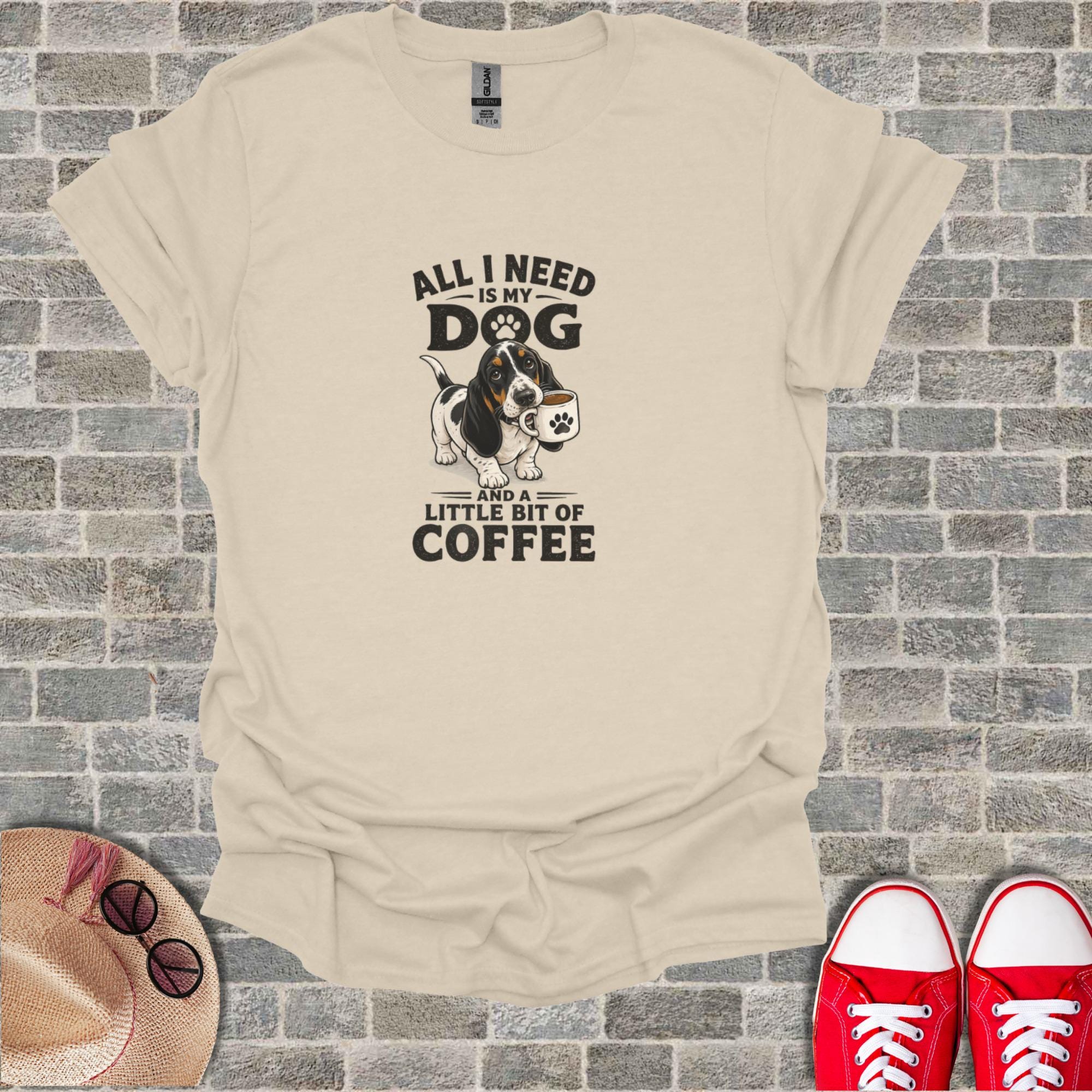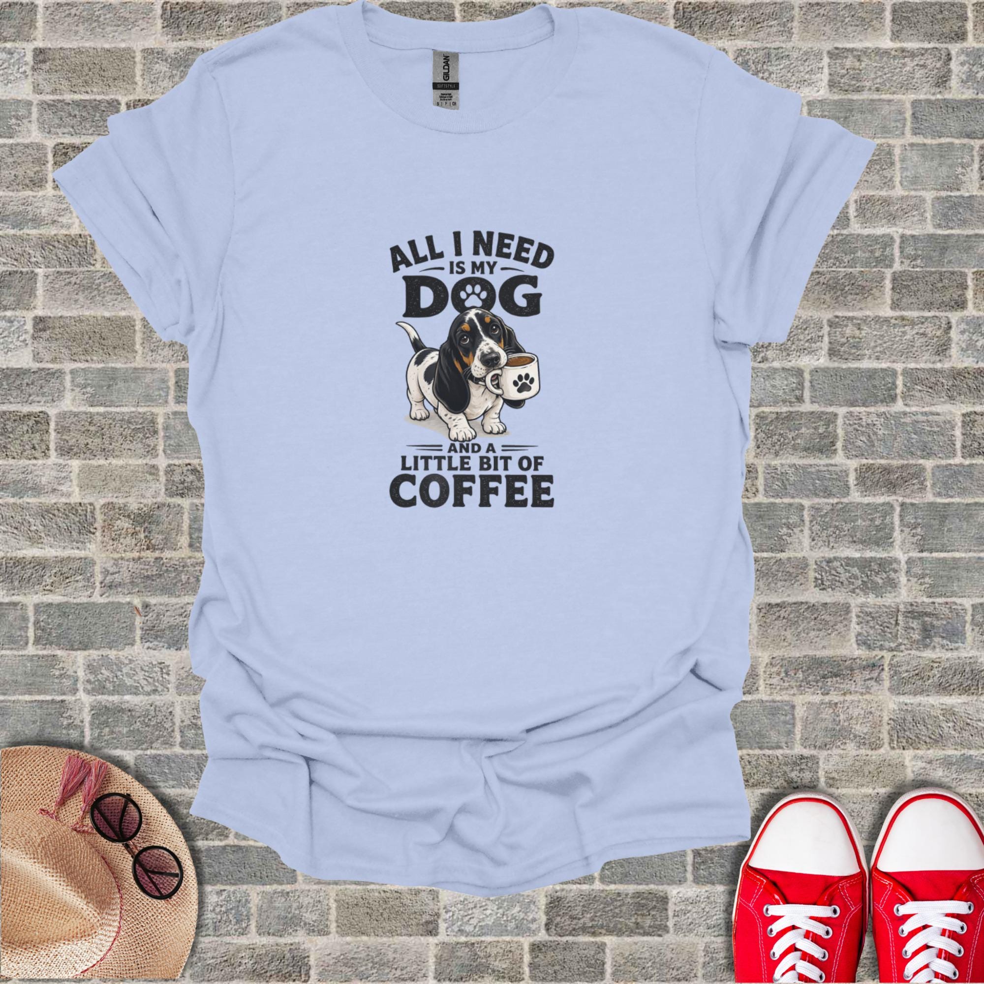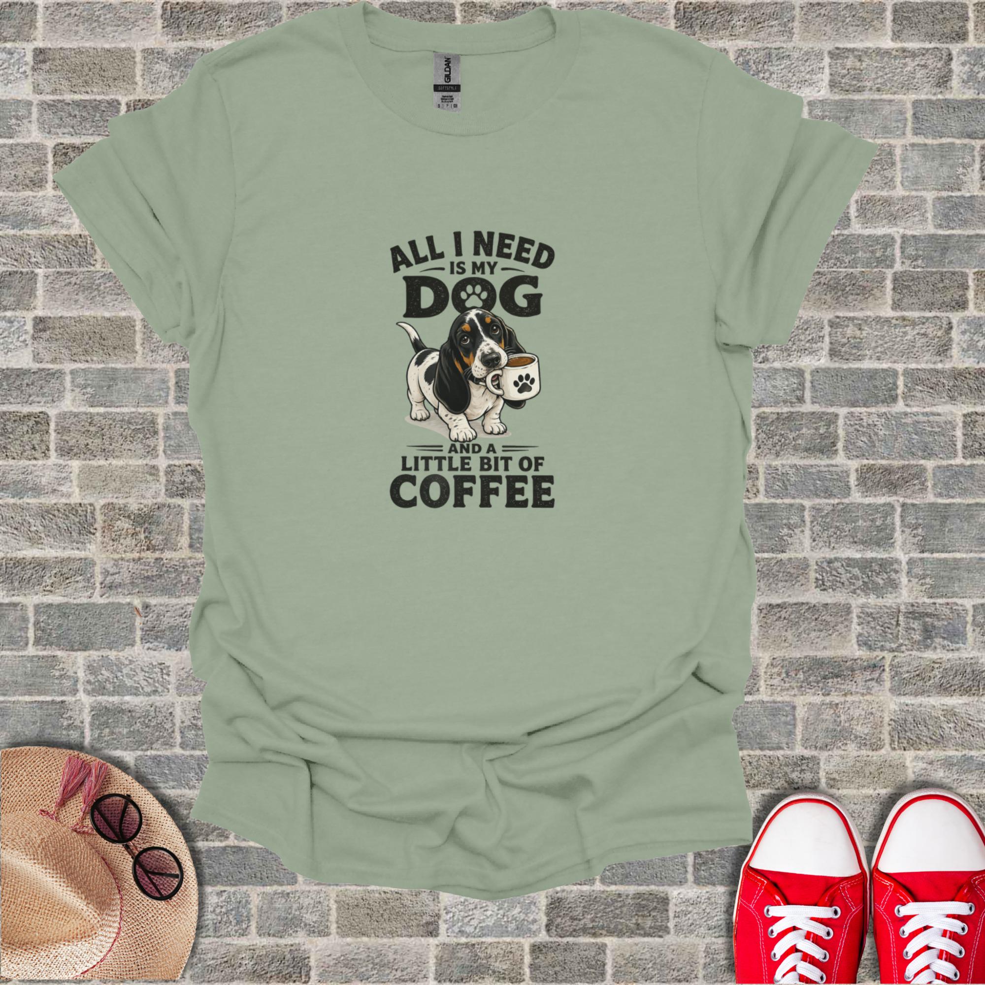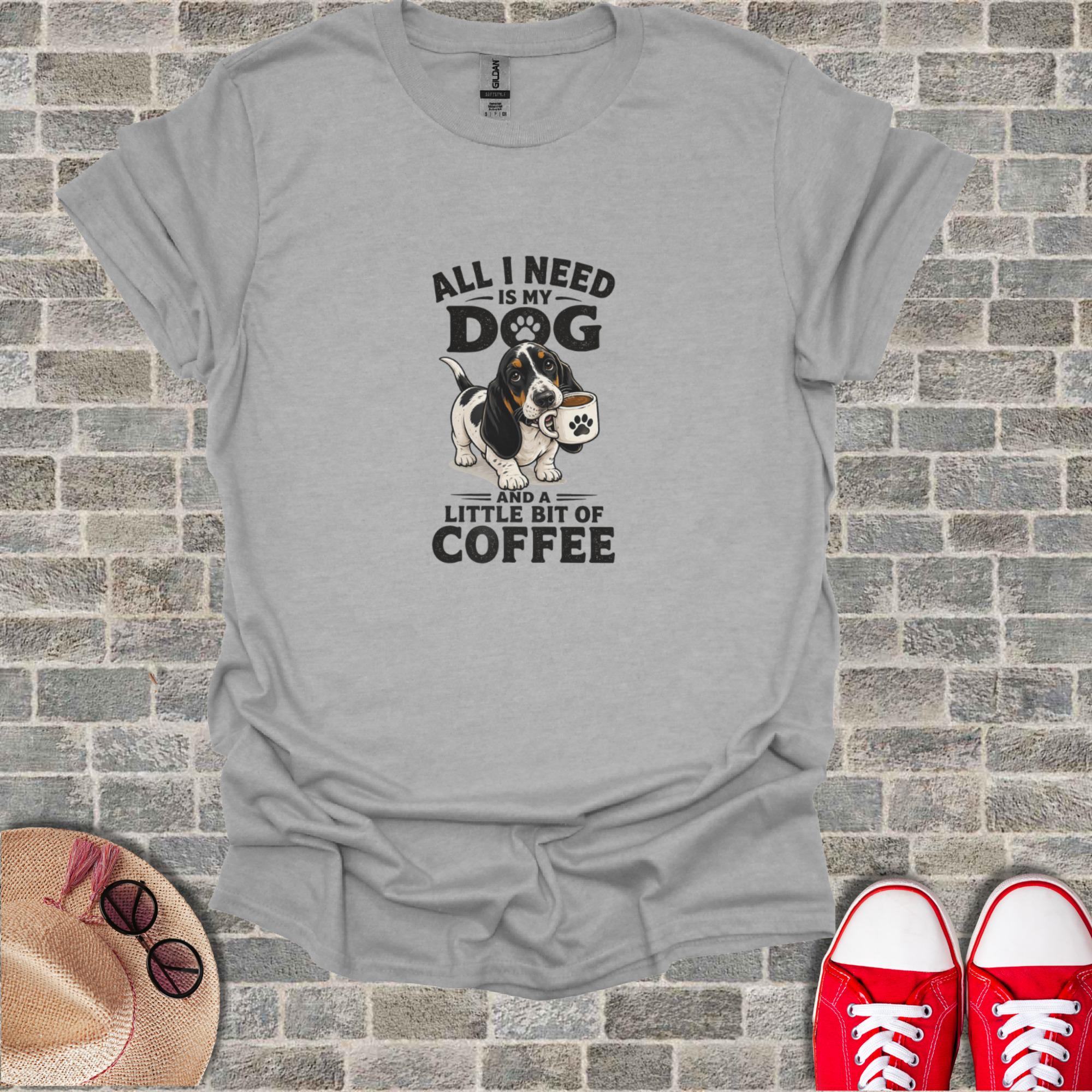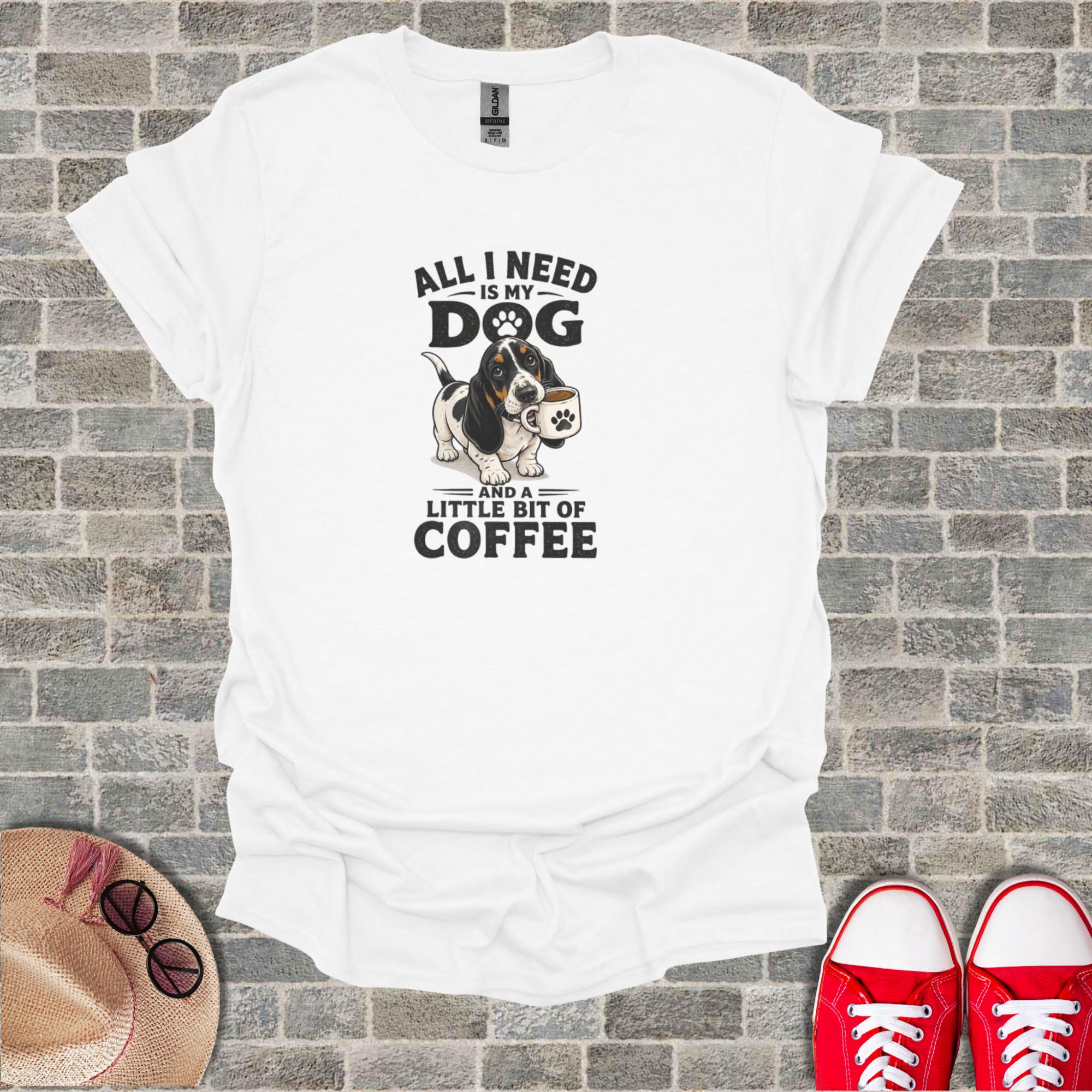 Celebrate your love for Basset Hounds and coffee with this delightful T-Shirt. This unique design features an adorable Basset Hound with a coffee cup, accompanied by the relatable phrase 'All I Need Is My Dog And A Little Bit Of Coffee'. It's the perfect statement piece for any dog mom, dog dad, or coffee enthusiast. An excellent gift for pet owners who cherish their furry friends and their morning brew, this T-Shirt combines humor and heartfelt affection. Show off your passion for pets and caffeine with this charming graphic tee, ideal for casual wear, dog park adventures, or simply relaxing at home.