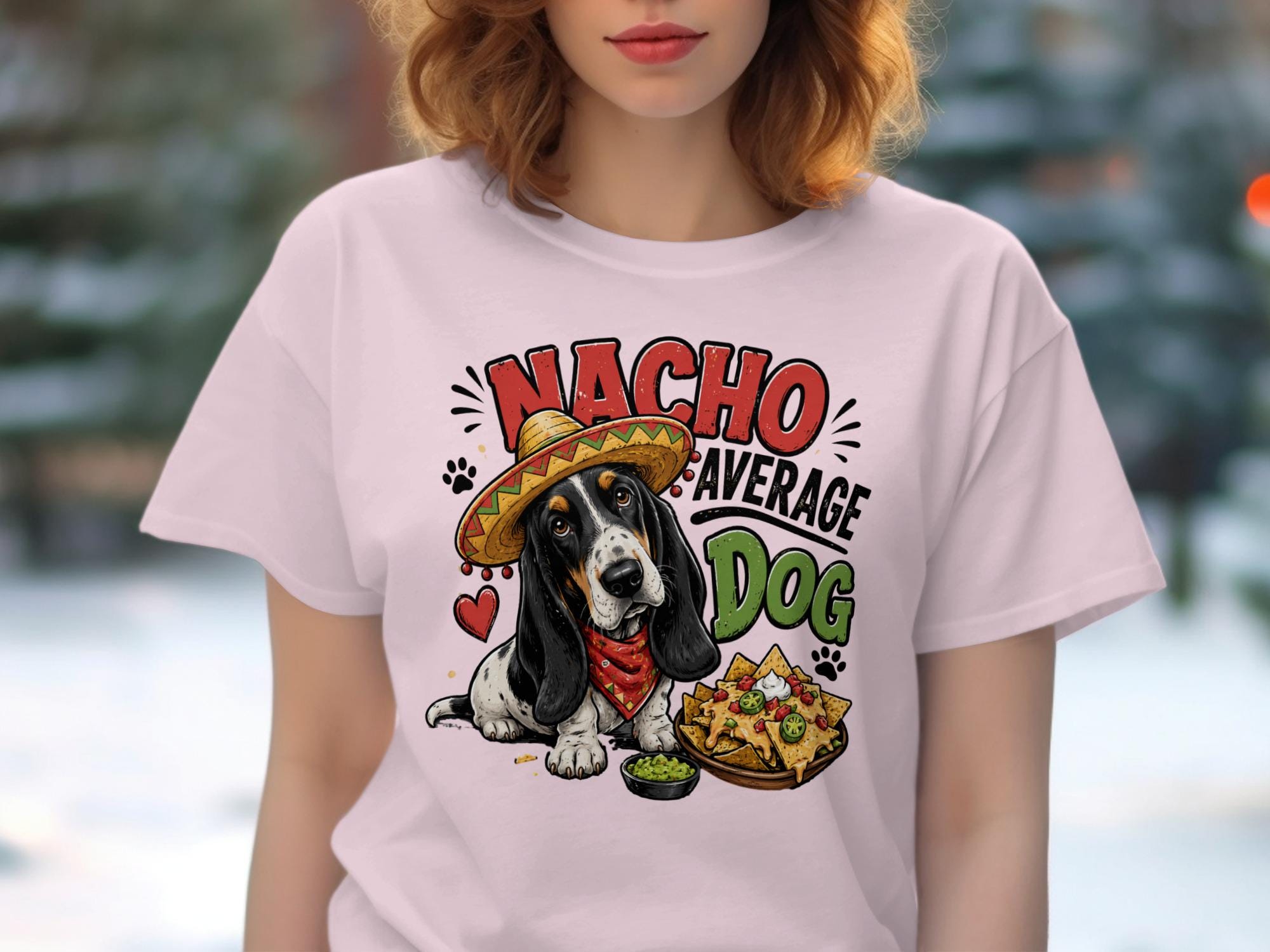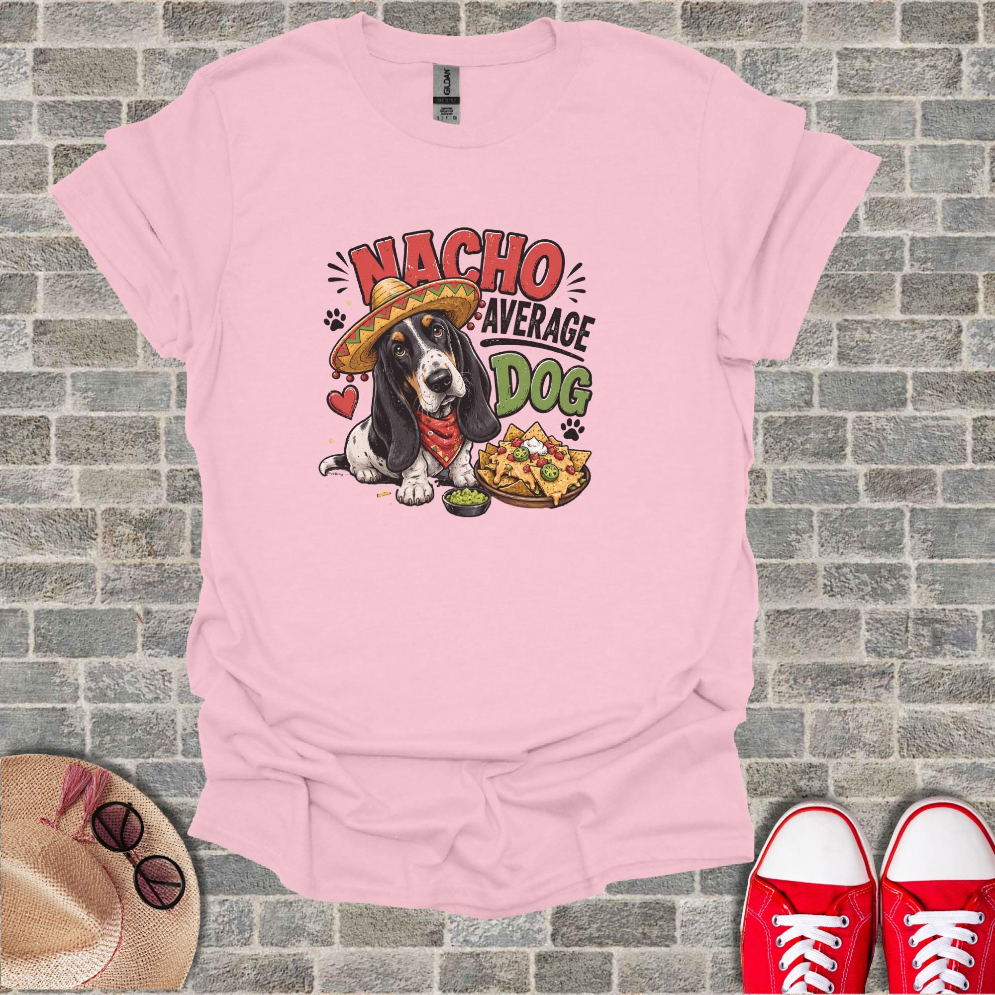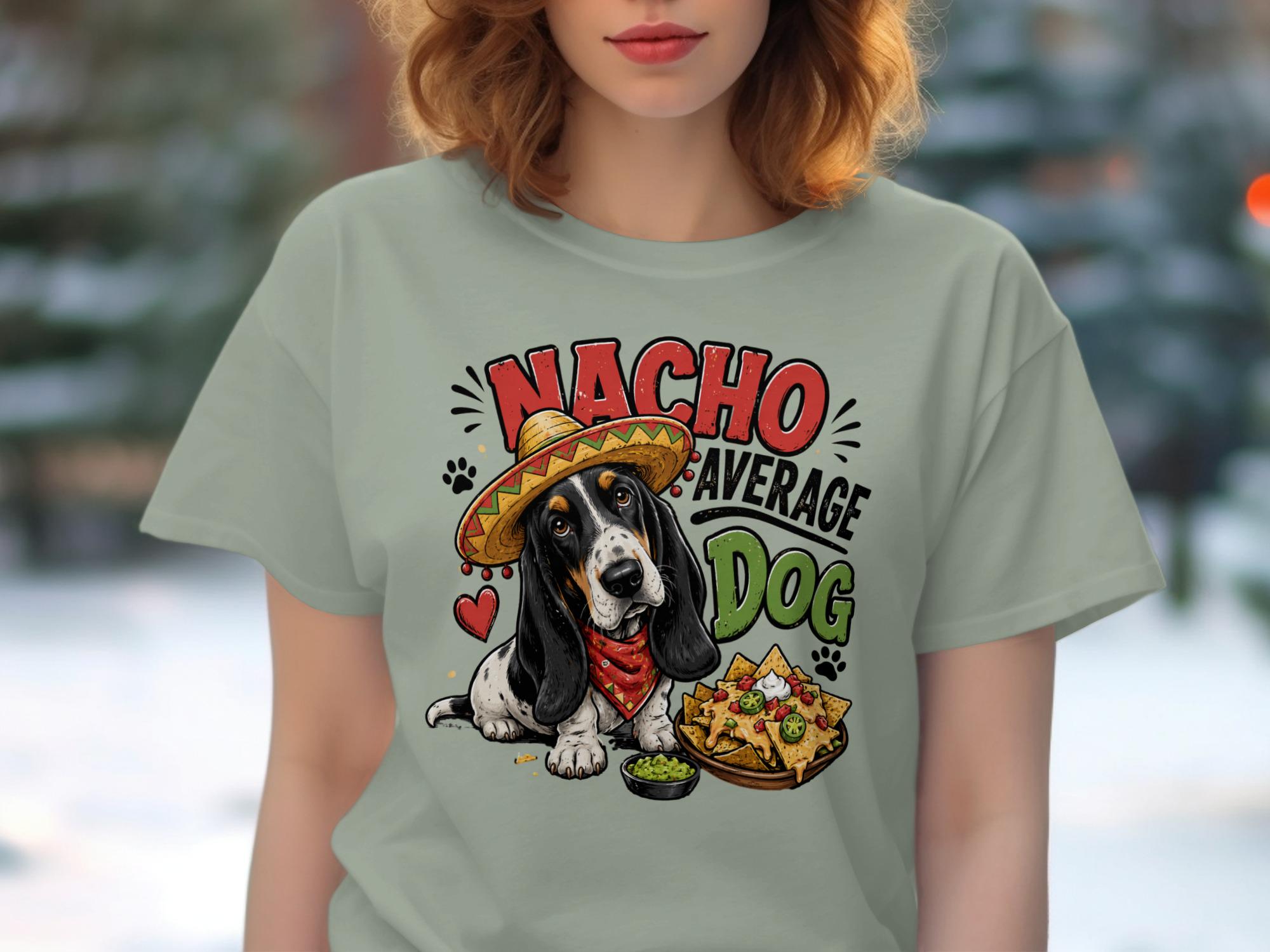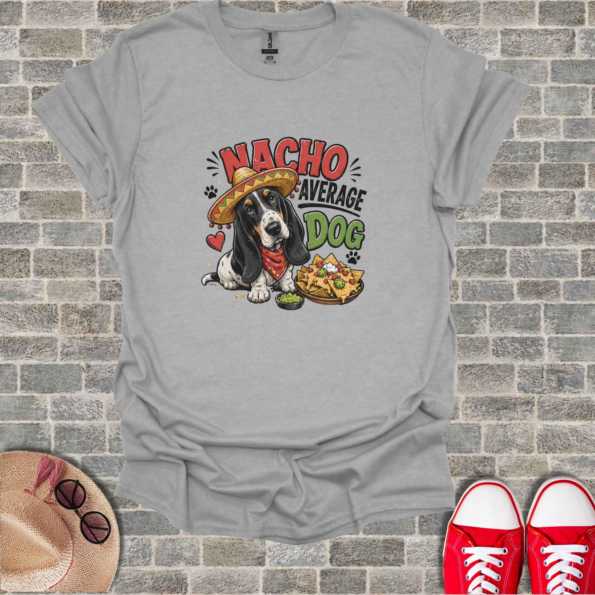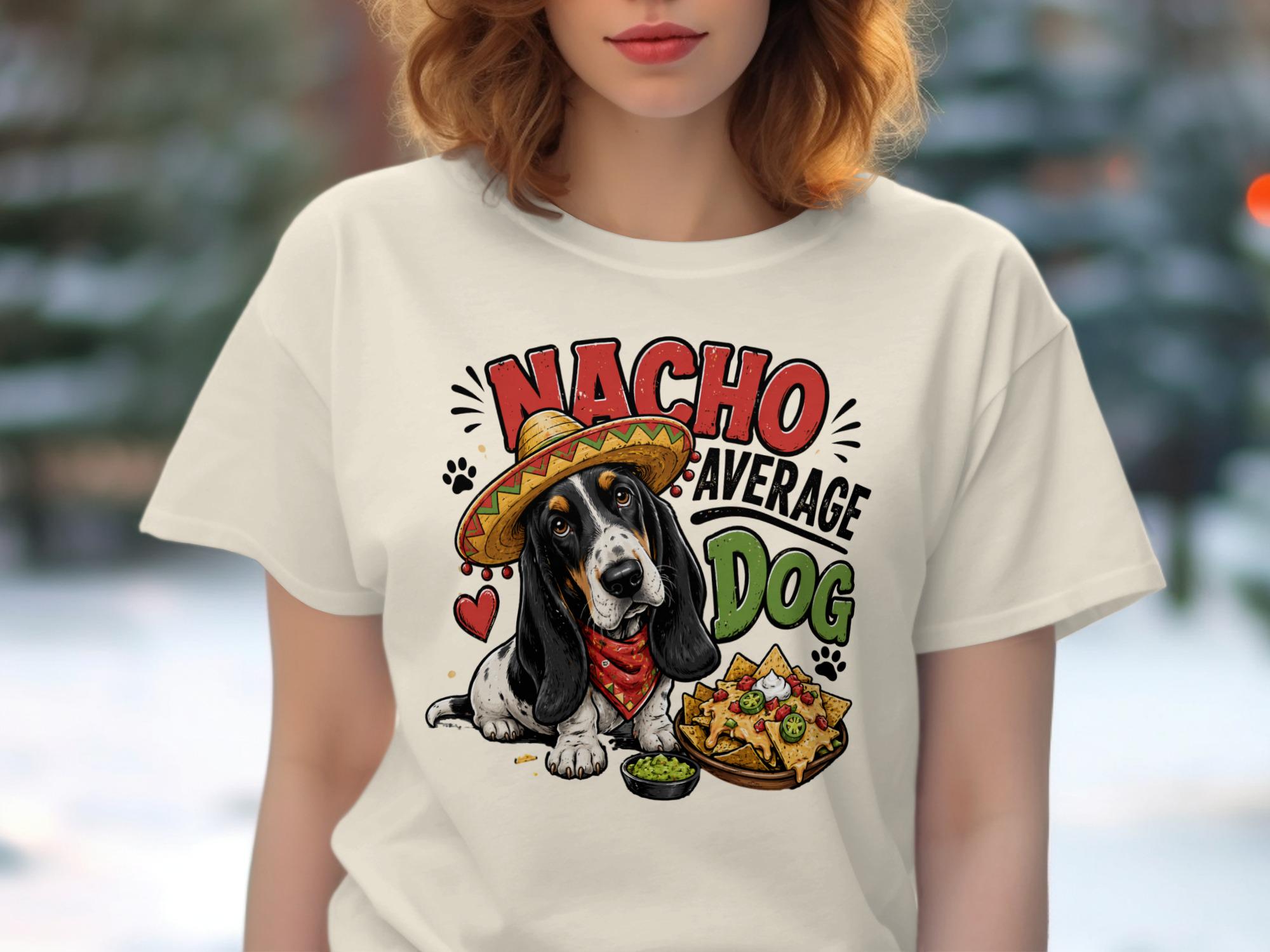 Step out in style with our hilarious "Nacho Average Dog" Basset Hound T-Shirt, a perfect blend of humor and cuteness. This unique tee features an adorable Basset Hound wearing a festive sombrero and bandana, sitting proudly next to a delicious plate of nachos and guacamole. It’s an ideal T-Shirt for dog lovers, Mexican food enthusiasts, and anyone with a good sense of humor. Celebrate your love for pups and savory snacks with this eye-catching graphic T-Shirt. A fantastic gift for birthdays, holidays, or just because, this Basset Hound T-Shirt is sure to get smiles and compliments wherever you go. Show off your "Nacho Average" personality!