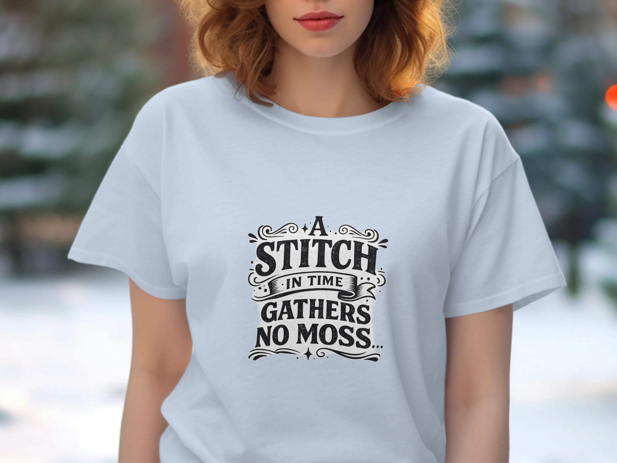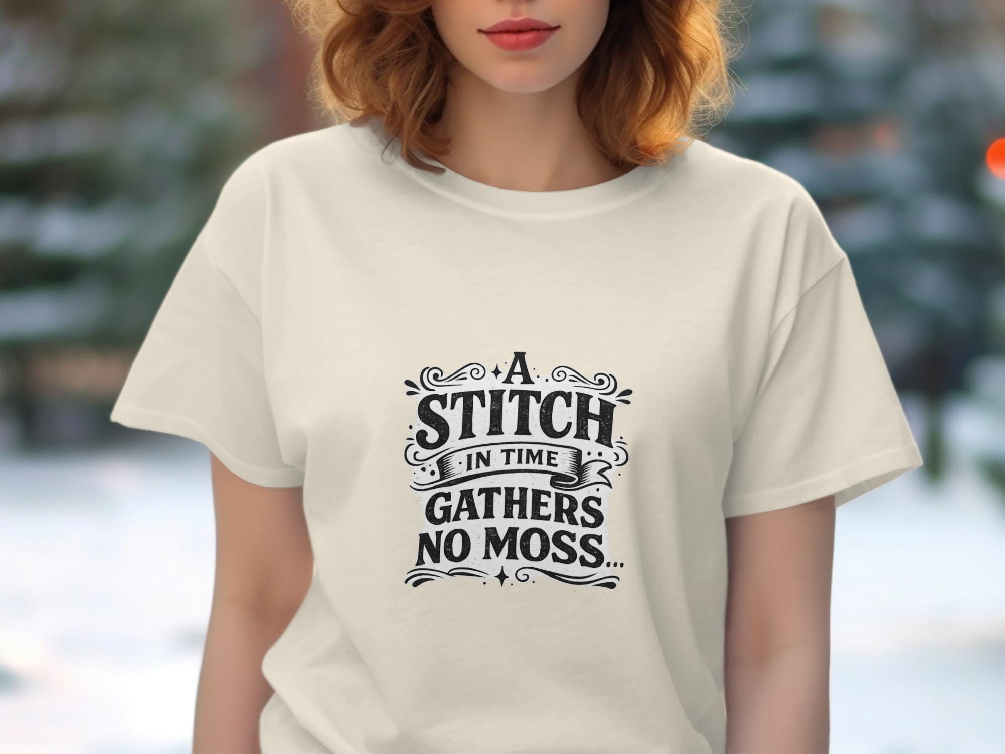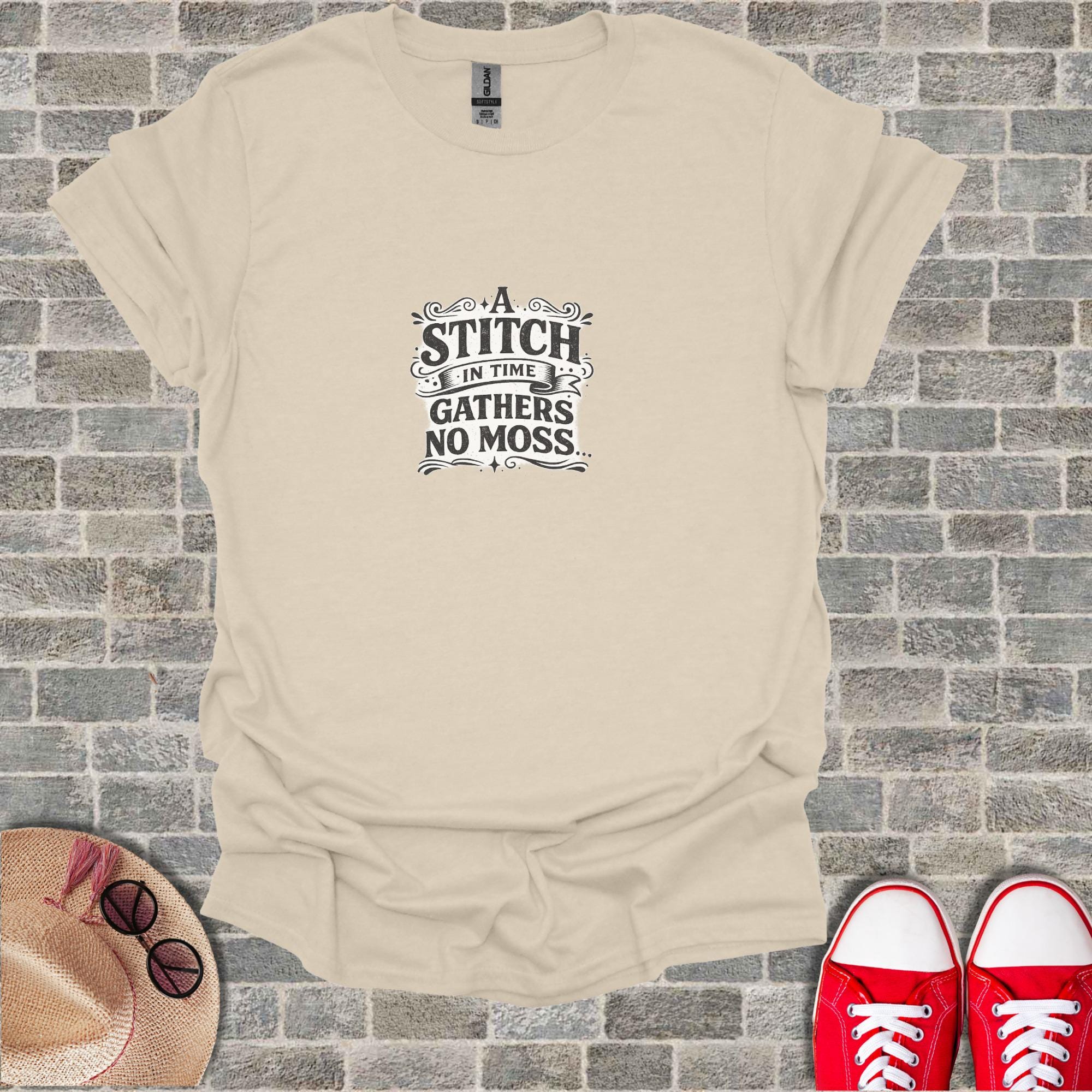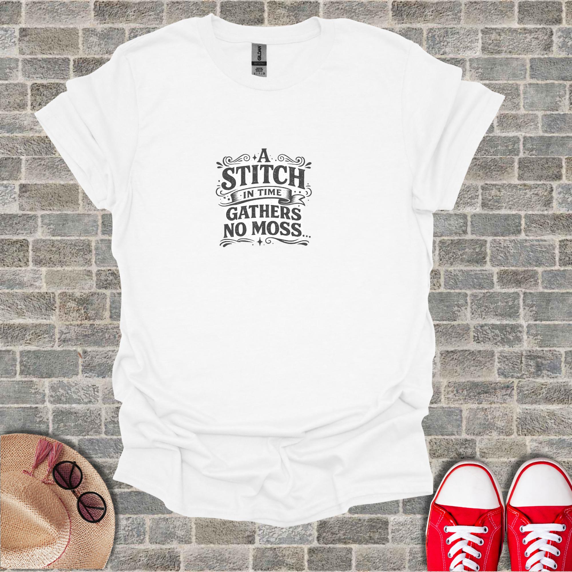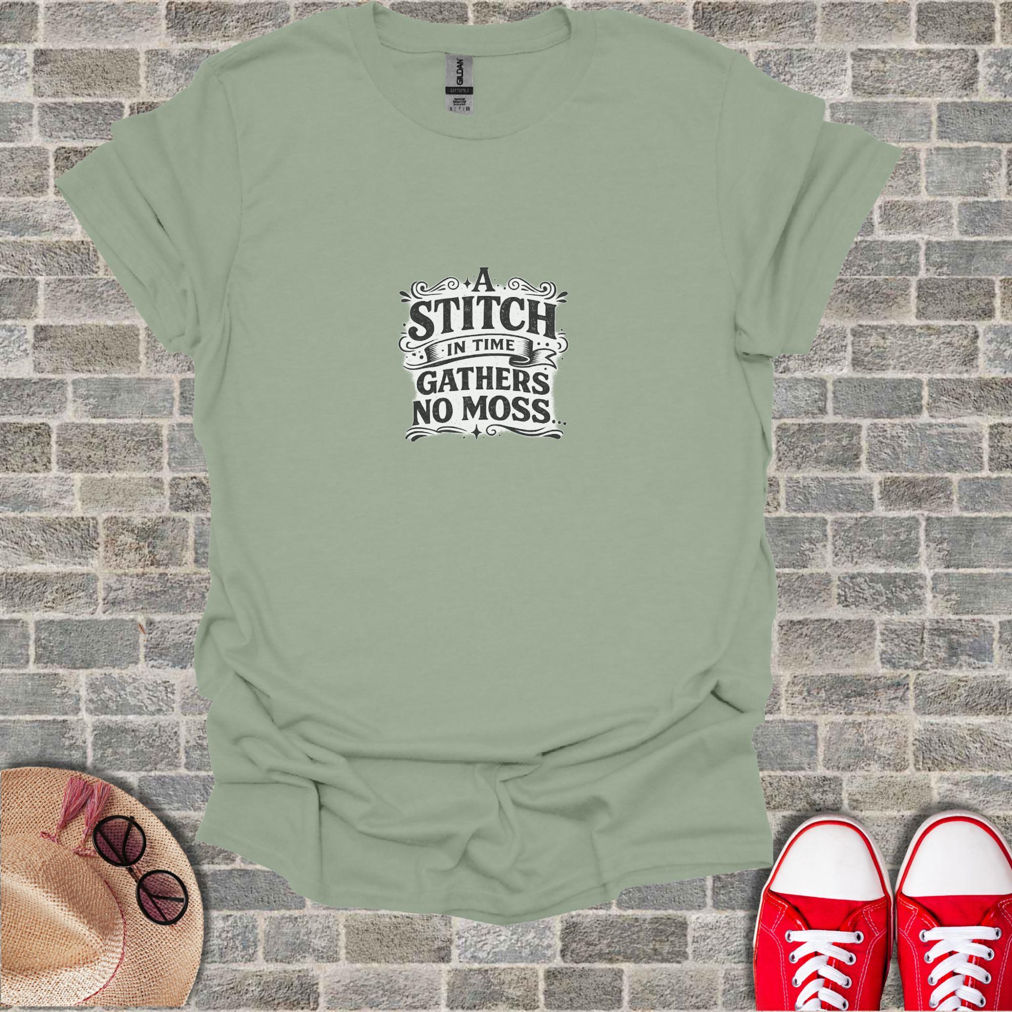 This stitch in time quote shirt features the classic "gathers no moss" proverb in a distinctive vintage wisdom apparel design that makes an excellent men's gift. The wise saying tee showcases timeless wisdom through motivational clothing with distressed typography, making it perfect vintage wisdom apparel for anyone who values meaningful proverb t shirts.